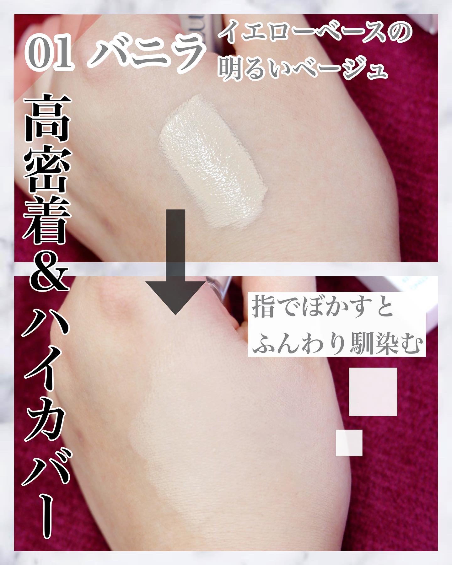 - <0.5 ポーセリン> 水、シクロペンタシロキサン、フェニルトリメチコン、タルク、セチルPEG/PPG-10/1ジメチコン、BG、PVP、ナイアシンアミド、(ビニルジメチコン/メチコンシルセスキオキサン)クロスポリマー、PEG-10ジメチコン、塩化Na、ジステアルジモニウムヘクトライト、トリエトキシカプリリルシラン、水酸化Al、p-アニス酸、カプリル酸グリセリル、パルミチン酸、ジメチコン、ステアリン酸、アデノシン、ツボクサエキス、スベリヒユエキス、カミツレ花エキス、セイヨウニンジンボク果実エキス、ヒポファエラムノイデス果実エキス、香料、酸化チタン、酸化鉄 <0.7 アイボリー> 水、シクロペンタシロキサン、フェニルトリメチコン、タルク、セチルPEG/PPG-10/1ジメチコン、BG、PVP、ナイアシンアミド、(ビニルジメチコン/メチコンシルセスキオキサン)クロスポリマー、PEG-10ジメチコン、塩化Na、ジステアルジモニウムヘクトライト、トリエトキシカプリリルシラン、水酸化Al、p-アニス酸、カプリル酸グリセリル、パルミチン酸、ジメチコン、ステアリン酸、アデノシン、ツボクサエキス、スベリヒユエキス、カミツレ花エキス、セイヨウニンジンボク果実エキス、ヒポファエラムノイデス果実エキス、香料、酸化チタン、酸化鉄 <01 バニラ> 水、シクロペンタシロキサン、フェニルトリメチコン、タルク、セチルPEG/PPG-10/1ジメチコン、BG、PVP、ナイアシンアミド、(ビニルジメチコン/メチコンシルセスキオキサン)クロスポリマー、PEG-10ジメチコン、塩化Na、ジステアルジモニウムヘクトライト、トリエトキシカプリリルシラン、水酸化Al、p-アニス酸、カプリル酸グリセリル、パルミチン酸、ステアリン酸、ジメチコン、アデノシン、ツボクサエキス、スベリヒユエキス、カミツレ花エキス、セイヨウニンジンボク果実エキス、ヒポファエラムノイデス果実エキス、香料、酸化チタン、酸化鉄 <02 ベージュ> 水、シクロペンタシロキサン、フェニルトリメチコン、タルク、セチルPEG/PPG-10/1ジメチコン、BG、PVP、ナイアシンアミド、(ビニルジメチコン/メチコンシルセスキオキサン)クロスポリマー、PEG-10ジメチコン、塩化Na、ジステアルジモニウムヘクトライト、トリエトキシカプリリルシラン、水酸化Al、p-アニス酸、カプリル酸グリセリル、パルミチン酸、ステアリン酸、ジメチコン、アデノシン、ツボクサエキス、スベリヒユエキス、カミツレ花エキス、セイヨウニンジンボク果実エキス、ヒポファエラムノイデス果実エキス、香料、酸化チタン、酸化鉄 <03 ブライト> 水、シクロペンタシロキサン、酸化チタン、炭酸ジエチルヘキシル、BG、ネオペンタン酸イソデシル、PEG-10ジメチコン、グリセリン、安息香酸アルキル(C12-15)、(VP/ヘキサデセン)コポリマー、ナイアシンアミド、クオタニウム-18ベントナイト、セスキオレイン酸ソルビタン、塩化Na、ミツロウ、シリカ、(ジメチコン/ビニルジメチコン)クロスポリマー、トリエトキシカプリリルシラン、水酸化Al、1,2-ヘキサンジオール、カプリリルグリコール、酢酸トコフェロール、アデノシン、ジメチコン、ツボクサエキス、スベリヒユエキス、カミツレ花エキス、セイヨウニンジンボク果実エキス、ヒポファエラムノイデス果実エキス、酸化鉄、グンジョウ