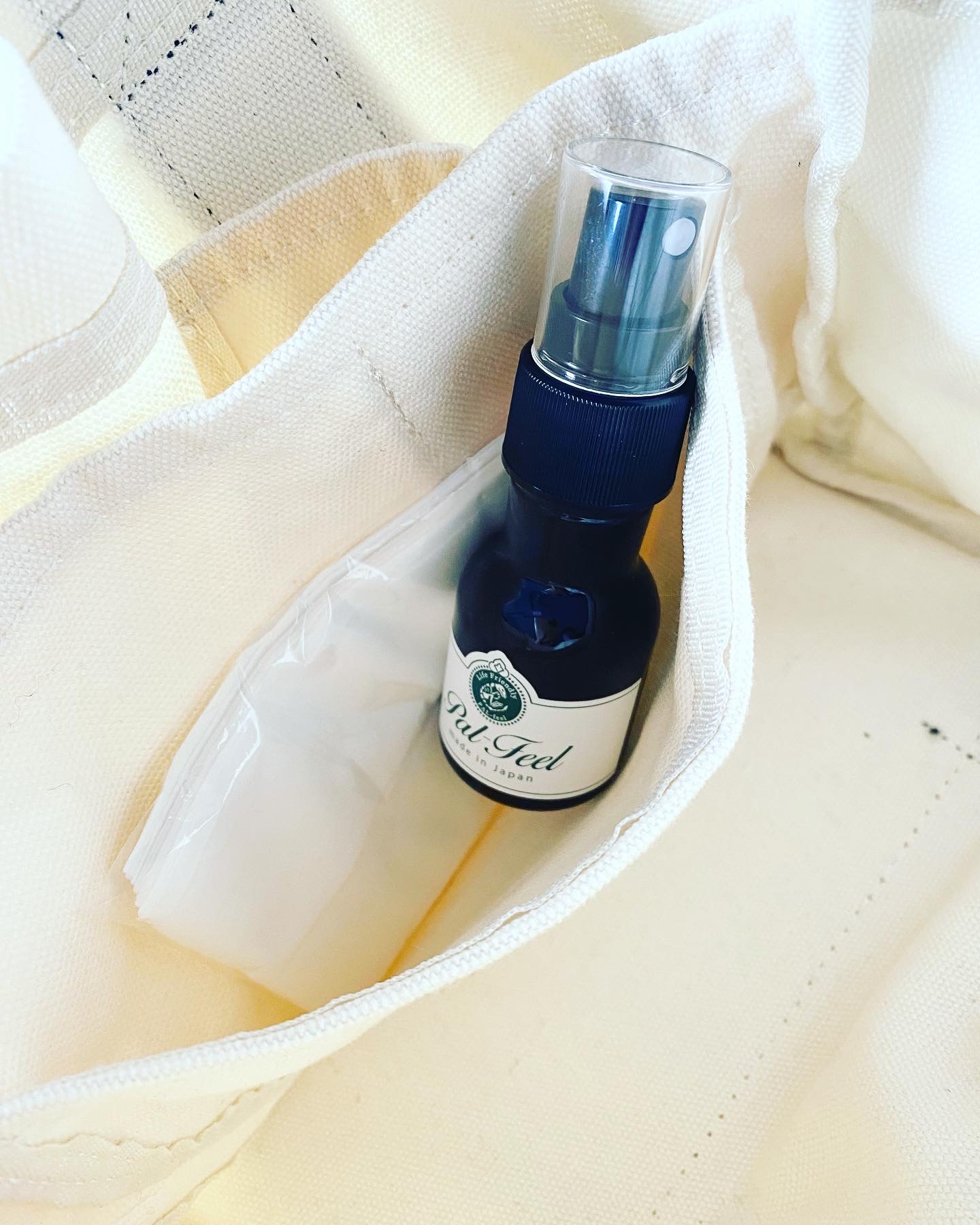 こちらは独自コーティング技術で、乾いた後も抗菌効果が持続するスプレーになります。 スプレーした表面に目に見えない程のコーティング膜を形成してくれるそうで何度も繰り返しスプレーをしなくても良いのが手間が少なくて嬉しいです。 Pal-Feel は香料も消臭剤も使用していないのですがスプレーすると不思議と嫌な匂いがしてこないのがとてもありがたいです。 効果と安全面にこだわった4つの安心成分で・精製水… 化粧水にも使われる清潔なお水です。 ・発酵アルコール… 食品にも使用できる安心のアルコールです。 ・Ag+系抗菌剤… 銀イオンにより、様々な菌やウイルス、カビを抑制します。 ・コーティング成分… 独自コーティング技術で、抗菌効果に持続性をもたらします。とそれぞれの成分もわかりやすく明記されているのも嬉しいですね。 見た目もすごくおしゃれなデザインで抗菌スプレーに見えないのでインテリアとしても邪魔をしないデザインなのが気に入っています。 手のひらサイズで簡単に持ち運びできるサイズなのもオススメです。
