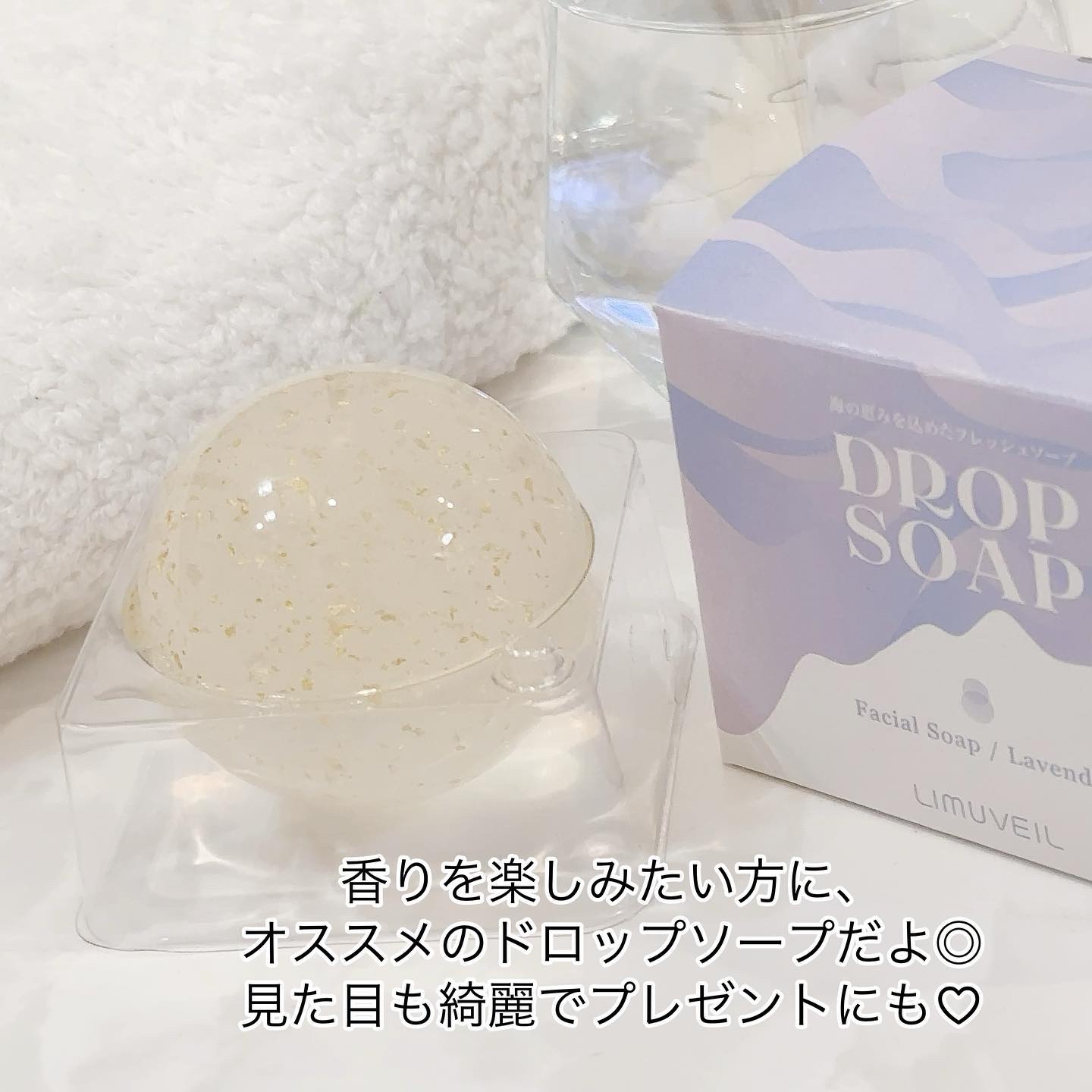 - ・ゼリーのような「ぷるんぷるん」と柔らかいドロップソープは、美容成分を贅沢配合した美容液のような洗顔石鹸です。含まれている美容成分の種類の違いにより、マリン、ライム、ラベンダーと3種類が用意されています。 ・このラベンダーにはキラキラとした金が散りばめられていて、含まれている美容成分は、整肌成分であるヒト幹細胞(ヒト脂肪細胞順化培養液エキス)。フコイダンを中心とした、ヒアルロン酸、プラセンタなど保湿成分も贅沢に配合されています。 ・固形石鹸でありながら保湿美容成分を贅沢に配合することを実現。ぷるんぷるんのゼリーがその秘密!かわいいだけじゃない、高機能な石鹸です。 ・アミノ酸系洗浄成分を使用しているので、泡も肌にやさしい使い心地、毛穴まで*美容成分が浸透します。乾燥肌や敏感肌の方にも。洗い上がりはしっとり、もっちりした仕上がりで 肌印象が明るくなる”うるツヤ肌”へ *角質層まで ・不思議な感触のドロップソープは風船に包まれているので、付属の楊枝で穴をあけて石鹸を取り出します。最初に手にした方は「これが石鹸なの?」とビックリすることでしょう。使用感、触っているときの心地良さを追求したぷるぷる洗顔です。 ・日常的な洗顔の手入れに活躍するのはもちろん、お誕生日、母の日など女性向けのプレゼントにはもってこい!もらった方が驚き、喜ばれること間違いなし!また、最近流行りのメンズ洗顔用としてのプレゼントもありですね! ・主な保湿成分であるフコイダンは、海藻から抽出された成分で見えないベールで大切なお肌を包み込んでくれます。一度洗顔すると毎朝、夜の洗顔が楽しみになるはすです!更に洗顔と一緒にハンドケアもできちゃいます! ・日常の朝晩の洗顔で約2ヶ月ぐらい長持ちするので、トータルなコスパも悪くないです。