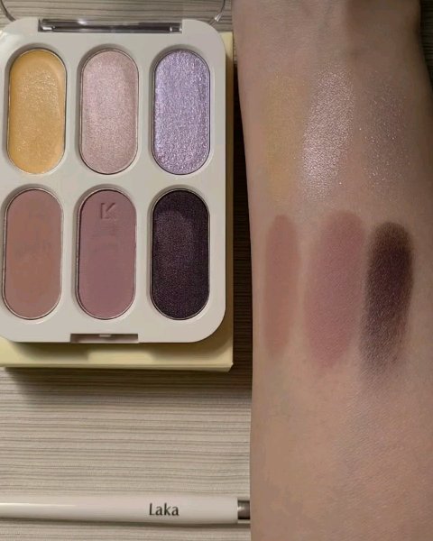 Lakaフォーエバー6アイパレット02 アテンションブルベ向け。全体的に紫がかった配色。④⑤のマットカラーは粉質が結構きめ細かいけどややパサパサしてる。似た粉質のウェイクメイクの16色パレットの方がしっとりしてる。①を使うとニュアンスチェンジ...