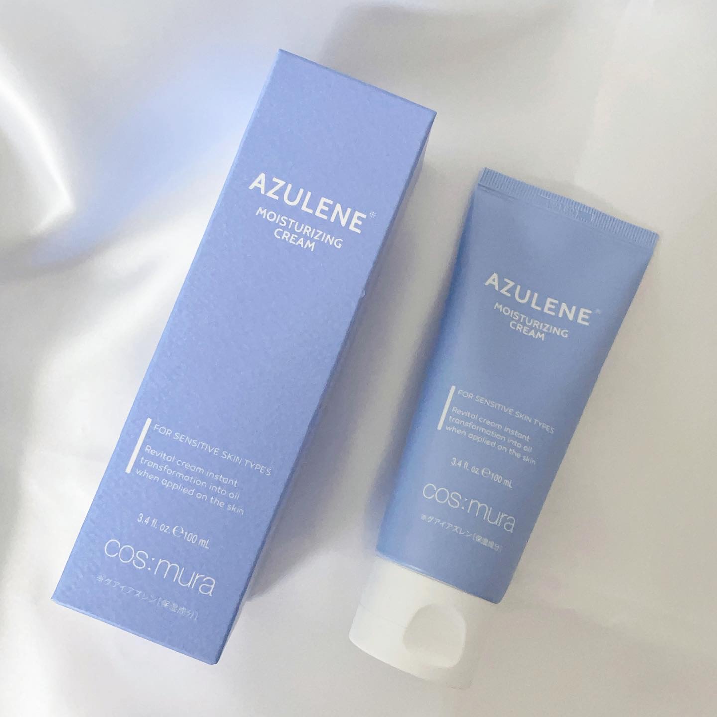 ポンプタイプで出す化粧水🧴 なんとこの化粧水250mlと大容量! なので惜しむことなくパシャパシャ使える😆 乾燥肌、脂性肌どちらにも使えるクリーム! こちらも100mlという大容量サイズ🧴 少し青みがある商品なのですが人工色素ではなくアズレン成分の青み🫧 安心して使うことができました✨