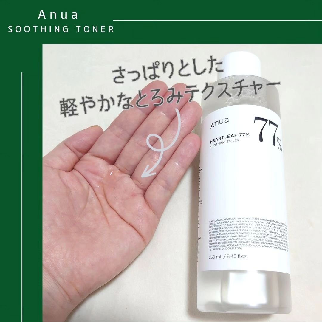 77%がドクダミエキス*1🍃 サラサラと軽やかなとろみテクスチャーで、すっとなじむ化粧水💕 肌にピタッと密着してバランスを整えてくれる🌿 ベタつかず、もっちりした使用感で使い心地もいい☺️ コットンにたっぷり含ませてコットンパックもオススメ👍 これから花粉の時期は特に肌がゆらぎやすいから、そーゆー時はAnuaだよね〜♪