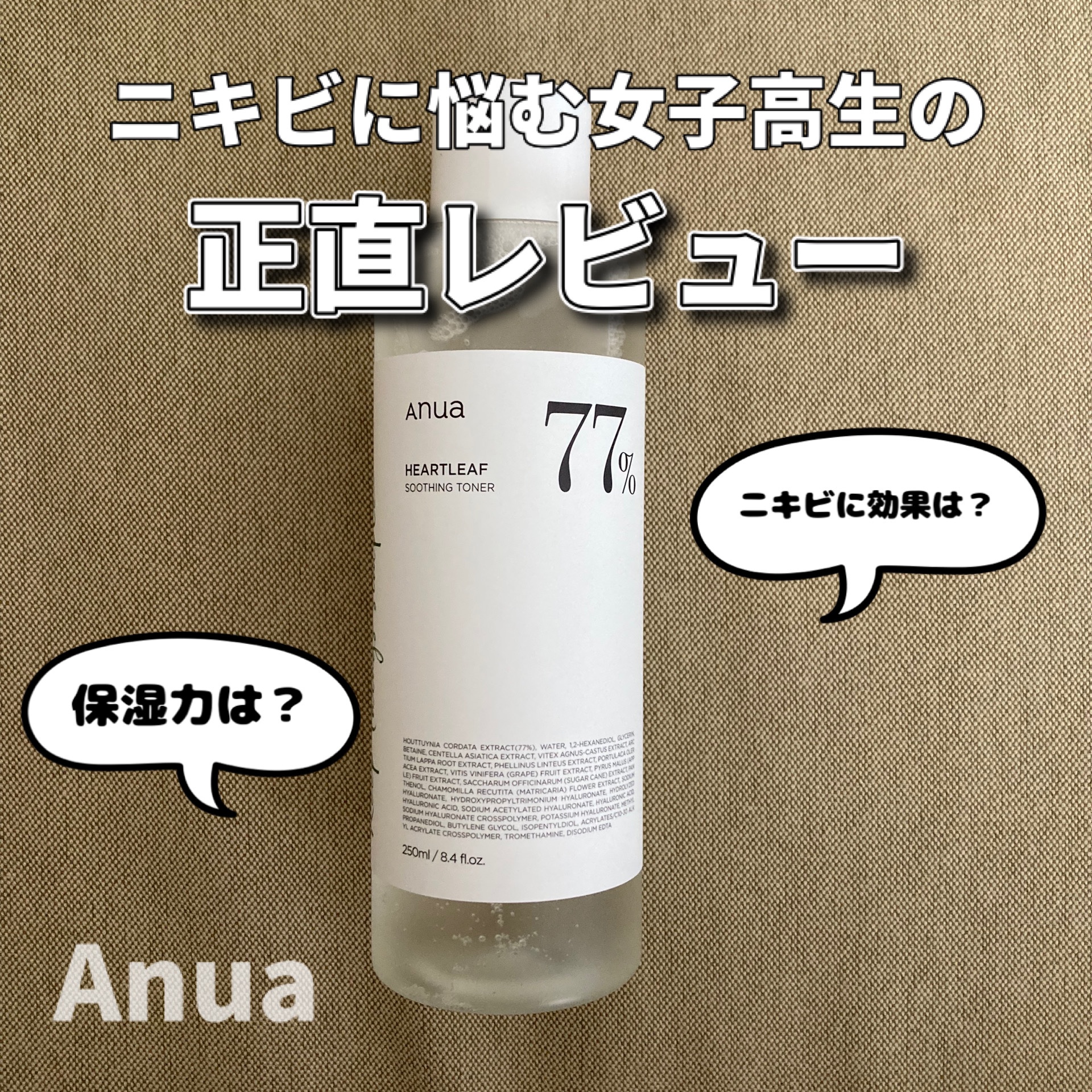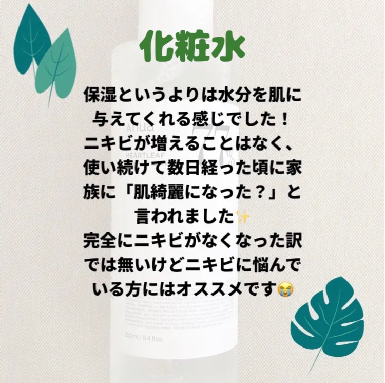 ボトルにでっかく書いてある77はドクダミソウエキスが配合されている割合のこと! ドクダミソウエキスには、抗炎症作用(炎症や赤みを抑える)や抗酸化作用(シミやシワを防ぐ)などが含まれている! でもサラッとしていて使いやすいから肌荒れしてない調子の良い日に使ってる!