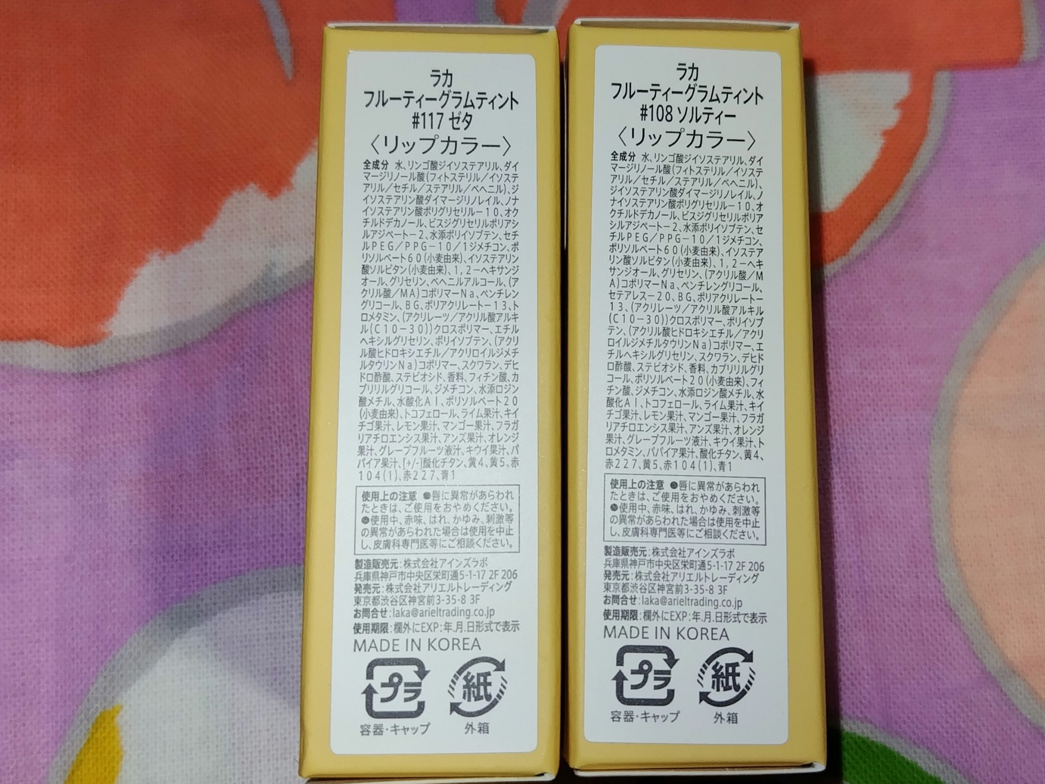 - <101 ジョイフル> 水、リンゴ酸ジイソステアリル、ダイマージリノール酸(フィトステリル/イソステアリル/セチル/ステアリル/ベヘニル)、ジイソステアリン酸ダイマージリノレイル、ノナイソステアリン酸ポリグリセリル-10、オクチルドデカノール、ビスジグリセリルポリアシルアジペート-2、水添ポリイソブテン、セチルPEG/PPG-10/1ジメチコン、ポリソルベート60(小麦由来)、イソステアリン酸ソルビタン(小麦由来)、1,2-ヘキサンジオール、グリセリン、ベヘニルアルコール、(アクリル酸/MA)コポリマーNa、ペンチレングリコール、BG、ポリアクリレート-13、トロメタミン、(アクリレーツ/アクリル酸アルキ ル(C10-30 )クロスポリマー、エチルヘキシルグリセリン、ポリイソブテン、(アクリル酸ヒドロキシエチル/アクリロイルジメチルタウリンNa)コポリマー、スクワラン、デヒドロ酢酸、ステビオシド、香料、フィチン酸、カプリリルグリコール、ジメチコン、水添ロジン酸メチル、水酸化Al、ポリソルベート20(小麦由来)、トコフェロール、ライム果汁、キイチゴ果汁、レモン果汁、マンゴー果汁、フラガリアチロエンシス果汁、アンズ果汁、オレンジ果汁、グレープフルーツ液汁、キウイ果汁、パパイア果汁、[+/-]酸化チタン、黄4、黄5、赤 104(1)、赤227、青1 <102 デューイ> 水、リンゴ酸ジイソステアリル、ダイマージリノール酸(フィトステリル/イソステアリル/セチル/ステアリル/ベヘニル)、ジイソステアリン酸ダイマージリノレイル、ノナイソステアリン酸ポリグリセリル-10、オクチルドデカノール、ビスジグリセリルポリアシルアジペート-2、水添ポリイソブテン、セチルPEG/PPG-10/1ジメチコン、ポリソルベート60(小麦由来)、イソステアリン酸ソルビタン(小麦由来)、1,2-ヘキサンジオール、グリセリン、ベヘニルアルコール、(アクリル酸/MA)コポリマーNa、ペンチレングリコール、BG、ポリアクリレート-13、トロメタミン、(アクリレーツ/アクリル酸アルキル(C10-30))クロスポリマー、エチルヘキシルグリセリン、ポリイソブテン、(アクリル酸ヒドロキシエチル/アクリロイルジメチルタウリンNa)コポリマー、スクワラン、デヒドロ酢酸、ステビオシド、香料、フィチン酸、ジメチコン、水添ロジン酸メチル、水酸化Al、カプリリルグリコール、ポリソルベート20(小麦由来)、トコフェロール、ライム果汁、キイチゴ果汁、レモン果汁、マンゴー果汁、フラガリアチロエンシス果汁、アンズ果汁、オレンジ果汁、グレープフルーツ液汁、キウイ果汁、パパイア果汁、酸化チタン、赤227、黄5、黄4、青1 <103 ハミング> 水、リンゴ酸ジイソステアリル、ダイマージリノール酸(フィトステリル/イソステアリル/セチル/ステアリル/ベヘニル)、ジイソステアリン酸ダイマージリノレイル、ノナイソステアリン酸ポリグリセリル-10、オクチルドデカノール、ビスジグリセリルポリアシルアジペート-2、水添ポリイソブテン、セチルPEG/PPG-10/1ジメチコン、ポリソルベート60(小麦由来)、イソステアリン酸ソルビタン(小麦由来)、1,2-ヘキサンジオール、グリセリン、ベヘニルアルコール、(アクリル酸/MA)コポリマーNa、ペンチレングリコール、BG、ポリアクリレート-13、トロメタミン、(アクリレーツ/アクリル酸アルキル(C10-30))クロスポリマー、エチルヘキシルグリセリン、ポリイソブテン、(アクリル酸ヒドロキシエチル/アクリロイルジメチルタウリンNa)コポリマー、スクワラン、デヒドロ酢酸、ステビオシド、香料、フィチン酸、ジメチコン、水添ロジン酸メチル、水酸化Al、カプリリルグリコール、ポリソルベート20(小麦由来)、トコフェロール、ライム果汁、キイチゴ果汁、レモン果汁、マンゴー果汁、フラガリアチロエンシス果汁、アンズ果汁、オレンジ果汁、グレープフルーツ液汁、キウイ果汁、パパイア果汁、酸化チタン、黄5、赤227、青1 <104 チェリー> 水、リンゴ酸ジイソステアリル、ダイマージリノール酸(フィトステリル/イソステアリル/セチル/ステアリル/ベヘニル)、ジイソステアリン酸ダイマージリノレイル、ノナイソステアリン酸ポリグリセリル-10、オクチルドデカノール、ビスジグリセリルポリアシルアジペート-2、水添ポリイソブテン、セチルPEG/PPG- 10/1ジメチコン、イソステアリン酸ソルビタン(小麦由来)、ポリソルベート60(小麦由来)、1,2-ヘキサンジオール、グリセリン、ベヘニルアルコール、(アクリル酸/MA)コポリマーNa、ペンチレングリコール、BG、ポリアクリレート-13、ト ロメタミン、(アクリレーツ/アクリル酸ア ルキル(C10-30))クロスポリマー、エチルヘキシルグリセリン、ポリイソブテ ン、(アクリル酸ヒドロキシエチル/アクリ ロイルジメチルタウリンNa)コポリマー、スクワラン、デヒドロ酢酸、ステビオシド、香料、カプリリルグリコール、ポリソルベー ト20(小麦由来)、トコフェロール、ライム果汁、キイチゴ果汁、レモン果汁、マンゴー 果汁、フラガリアチロエンシス果汁、アンズ 果汁、オレンジ果汁、グレープフルーツ液 汁、キウ