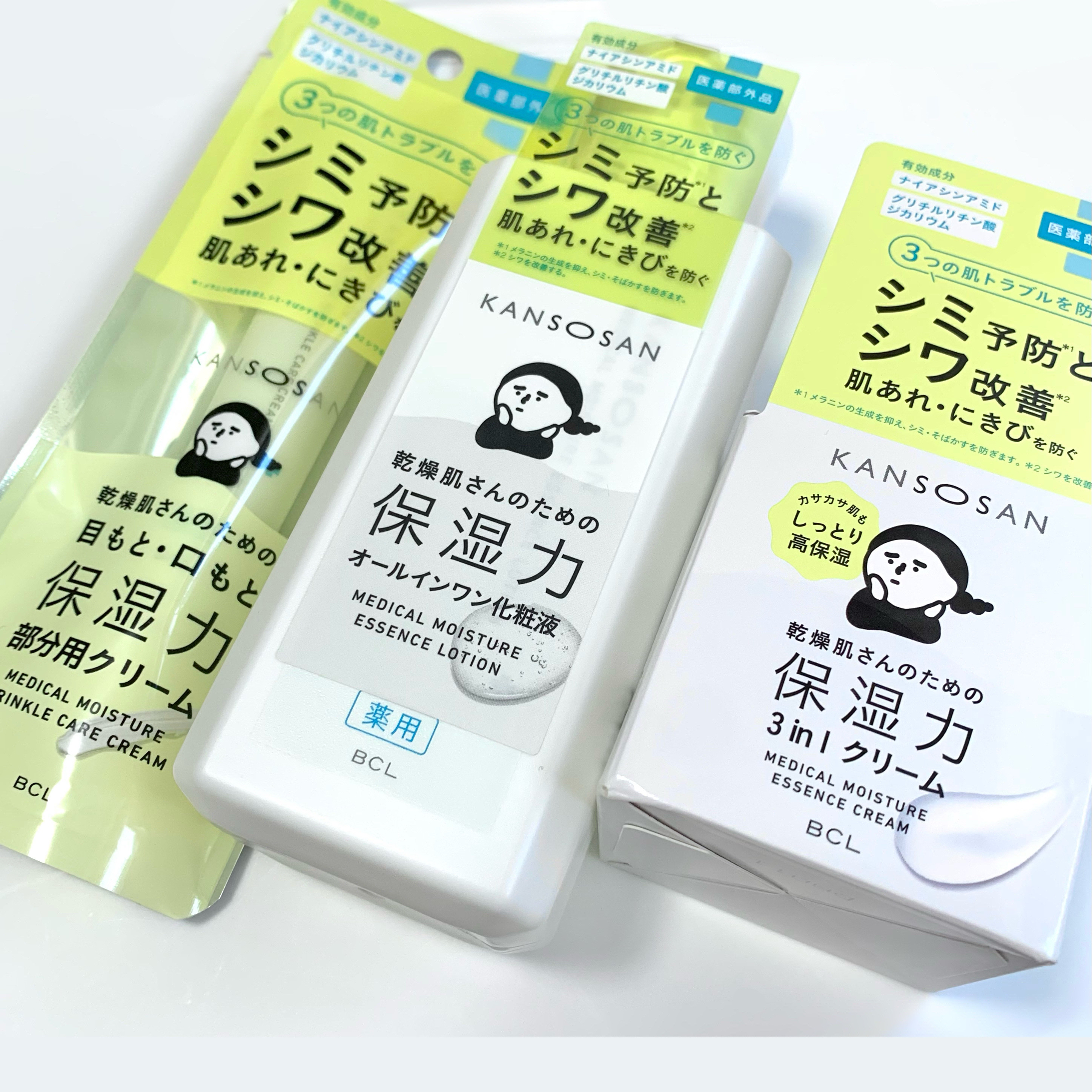 こちらの“乾燥さんメディカルシリーズ”は ♢シミ予防 ♢シワ改善 ♢肌あれ.にきびを防ぐという3つの肌トラブルに着目したスキンケアです 有効成分であるナイアシンアミドとグリチルリチル酸ジカリウムがメラニンの生成を抑制しシミやソバカスを防いだり、シワの改善やニキビを防ぎます なんと1本で「化粧水」「美容液」「乳液」のオールインワン!とろんとしたテクスチャーでホンッとにしっとりで手のひらが肌に吸い付く感じです