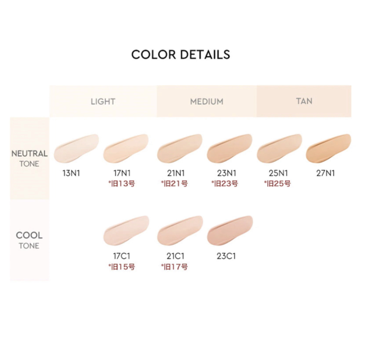 - きめ細かく肌にフィットして密着するレイヤーレスカバー 素肌のように軽いベルベット肌が24時間*1つづくクッションファンデ 1.Layerless Matte Cover 薄く均一なカバー力を叶える「マグネフィットパウダー」と 肌の凸凹にきめ細かくなめらかに密着する「3レイヤーフィルム」を採用 ハイカバーなのに軽やかなフィット感 2.24 Hour High-End Stay 4つの特性で叶える完成度の高いフローレス肌が24時間*1持続 マスクプルーフ効果*1 3.Asian Skin Fit Shade アジア人女性の肌に合わせて設計された全7色のシェードバリエーション クッションファンデーションに最適な、少し明るめのブルーベース~ニュートラルトーン さまざまな肌色にマッチするシェードで、もっとも自分らしい肌トーンを演出