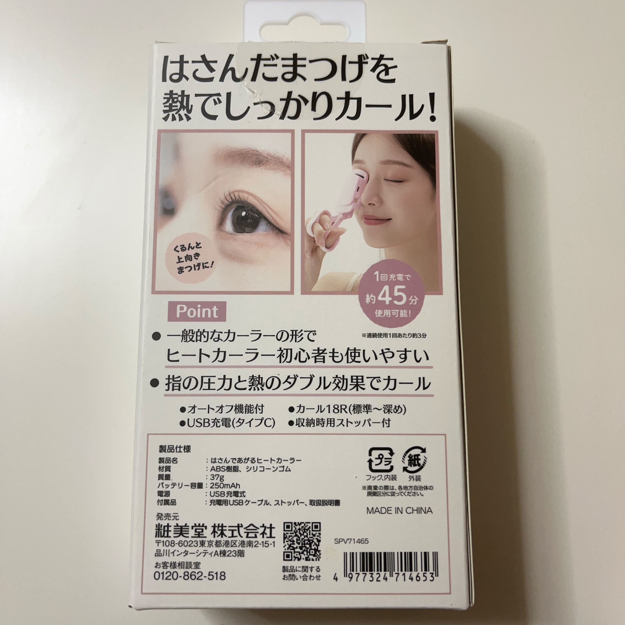 - はさんだまつげを熱でしっかりカール。 一般的なカーラーの形でヒートカーラー初心者の方にも使いやすい仕様です。 指の力と熱のダブル効果でまつげがしっかり上がります。 また、本商品はUSB充電式で、1回の充電で約45分使用可能です。 オートオフ機能付なので消し忘れの心配もありません。