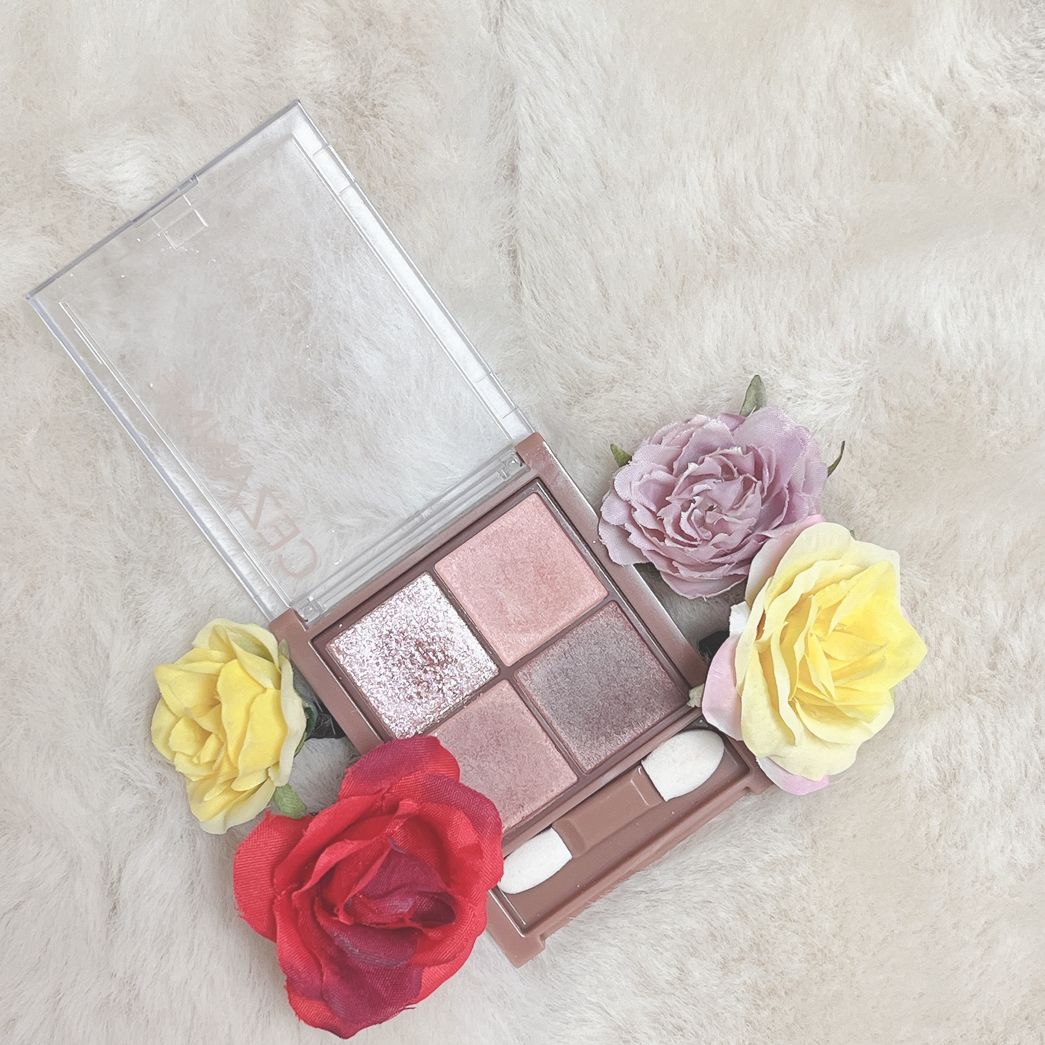 濃厚ブラウンで自然な陰影のある目元に仕上げるアイシャドウパレット🐻 透けマット×高輝度ラメの4色アイシャドウ👀💗 重ねてもくすみにくい透け感のあるマットカラーに、クリアな発色のラメをプラスして立体感と華やかさを演出✨ 優しげな目元になるまろやかなブラウンでデイリー使いしやすいカラーです