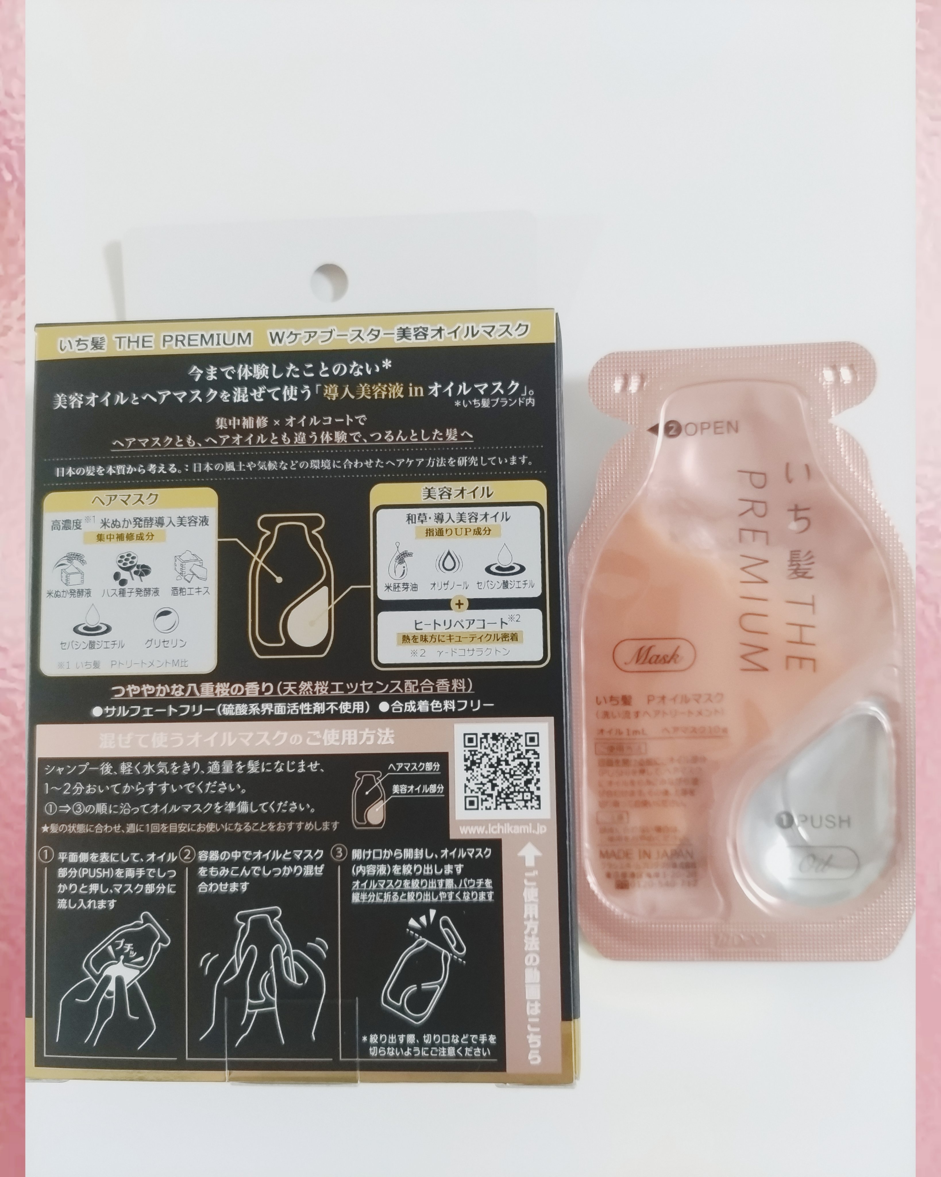 - ●「日本の髪を本質から考える。*1」ヘアケアブランド ●日本の髪研究の成果。アイロン等の熱ダメージによる乾燥髪のためのプレミアムダメージケアシリーズ ●今まで体験したことのない*2美容オイルを注入、混ぜるヘアマスク(洗い流すトリートメント) ●手触り、感動的。集中補修×オイルコートで、ヘアマスクとも、ヘアオイルとも違う体験で、つるんとした髪へ。 ●髪内部と外側をWでケアする「プレミアムWリペアシステム」 ・集中補修成分「高濃度*3米ぬか発酵導入美容液*4」配合のヘアマスクで、髪の内部を補修 ・指通りUP成分「和草・導入美容オイル*5」とドライヤーの熱を味方にキューティクルを密着する「ヒートリペアコート成分*6」で、髪の外側をコートして指通りをアップ ●つややかな八重桜の香り(天然桜エッセンス配合香料) ●サルフェートフリー(硫酸系界面活性剤不使用) ●合成着色料フリー *1:日本の風土や気候などの環境に合わせたヘアケア方法を研究しています。 *2:いち髪ブランド内 *3:いち髪 THE PREMIUM エクストラダメージケアトリートメント(シャイニーモイスト)比 *4:米ぬか発酵液、ハス種子発酵液、酒粕エキス、セバシン酸ジエチル、グリセリン *5:米胚芽油、オリザノール、セバシン酸ジエチル *6: γ-ドコサラクトン