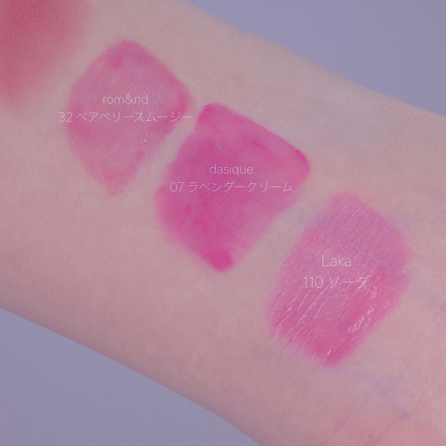 daisique スフレカラーポット 21 ローズティラミス 24 スモーキーライラック ¥1800 daisique ジューシーデュイティント 09ピーチプディング ¥1400 ロムアンド ゼロマットリップスティック 10 Pink sand ¥1399