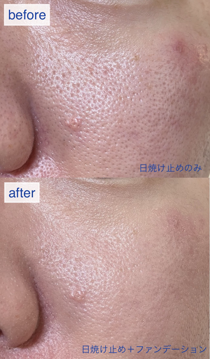 パフがふかふかしているためか、塗布する際に力が肌に伝わりにくく パフ塗りの方が、わずかながら、毛穴がより目立ちにくくなっているように見えます 表面がきめ細かく、ファンデーションが染み込みにくい点、 厚みがありふかふかしているため、余分な力が肌に伝わりにくい点
