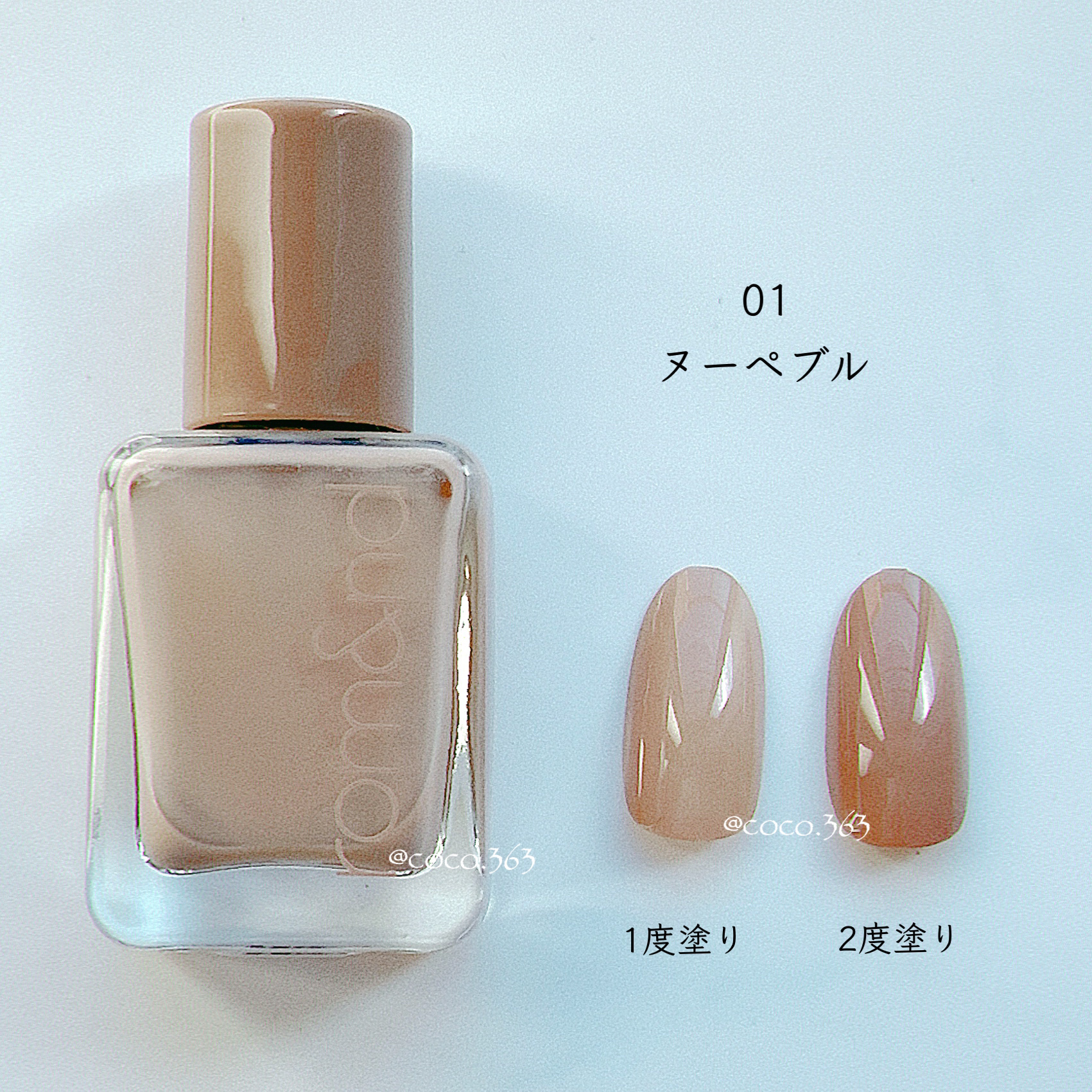 - 指先に玉石のような、ならかな光沢をとどめる。塗った瞬間から綺麗なツヤと光沢を維持し、重ねて塗っても透き通ったカラー感を鮮やかにとどめる、素早い乾燥力のナチュラルカラーネイル。「ロムアンド」の次世代型ネイルです。