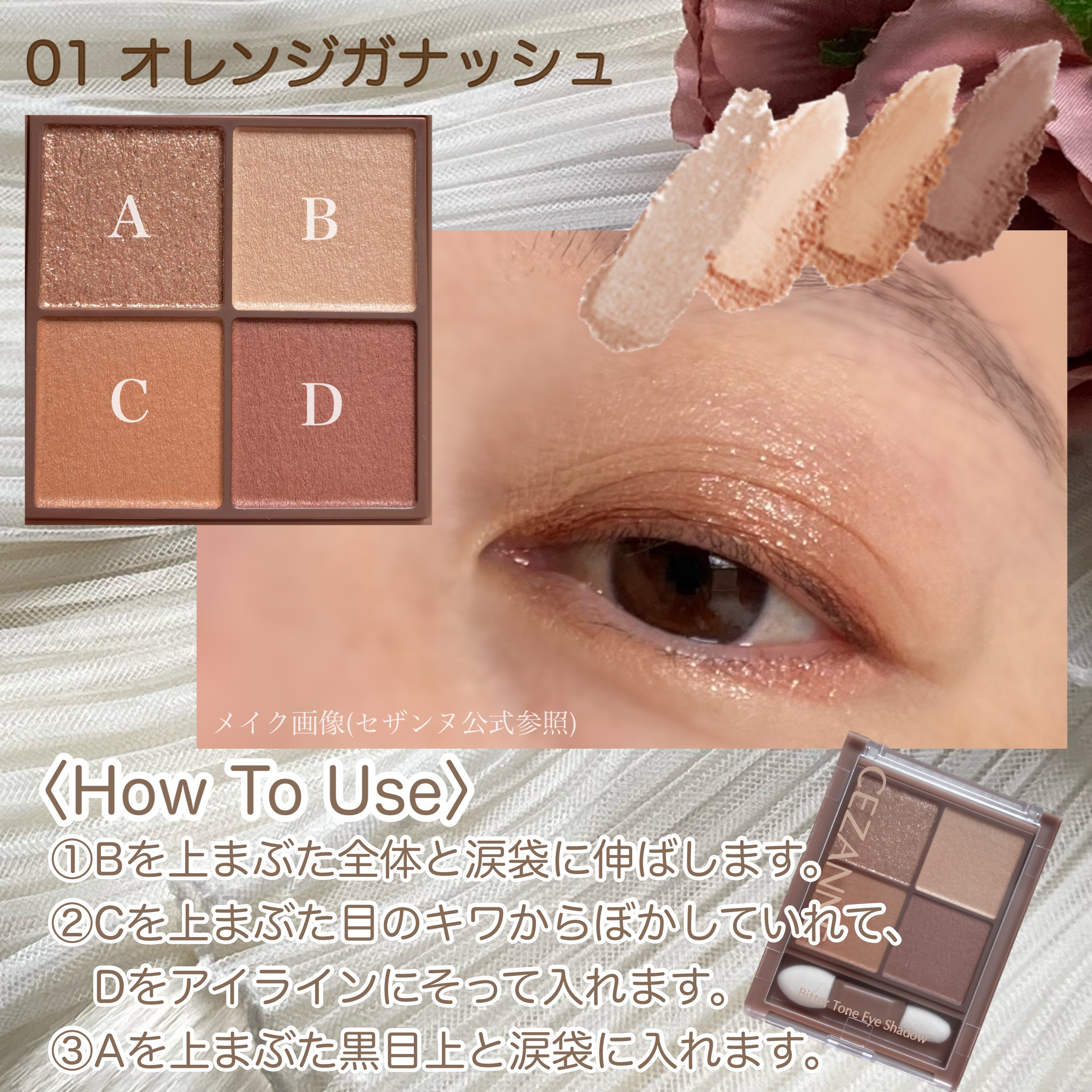 セザンヌビタートーンアイシャドウ01オレンジガナッシュ『ベーシックなのに洒落感のある温もりブラウン』・濃厚ブラウンで自然な陰影のある目元に・重ねてもくすみにくい、透け感のあるマットカラー・クリア発色のラメをプラスすると 立体感と華やかさを演出...