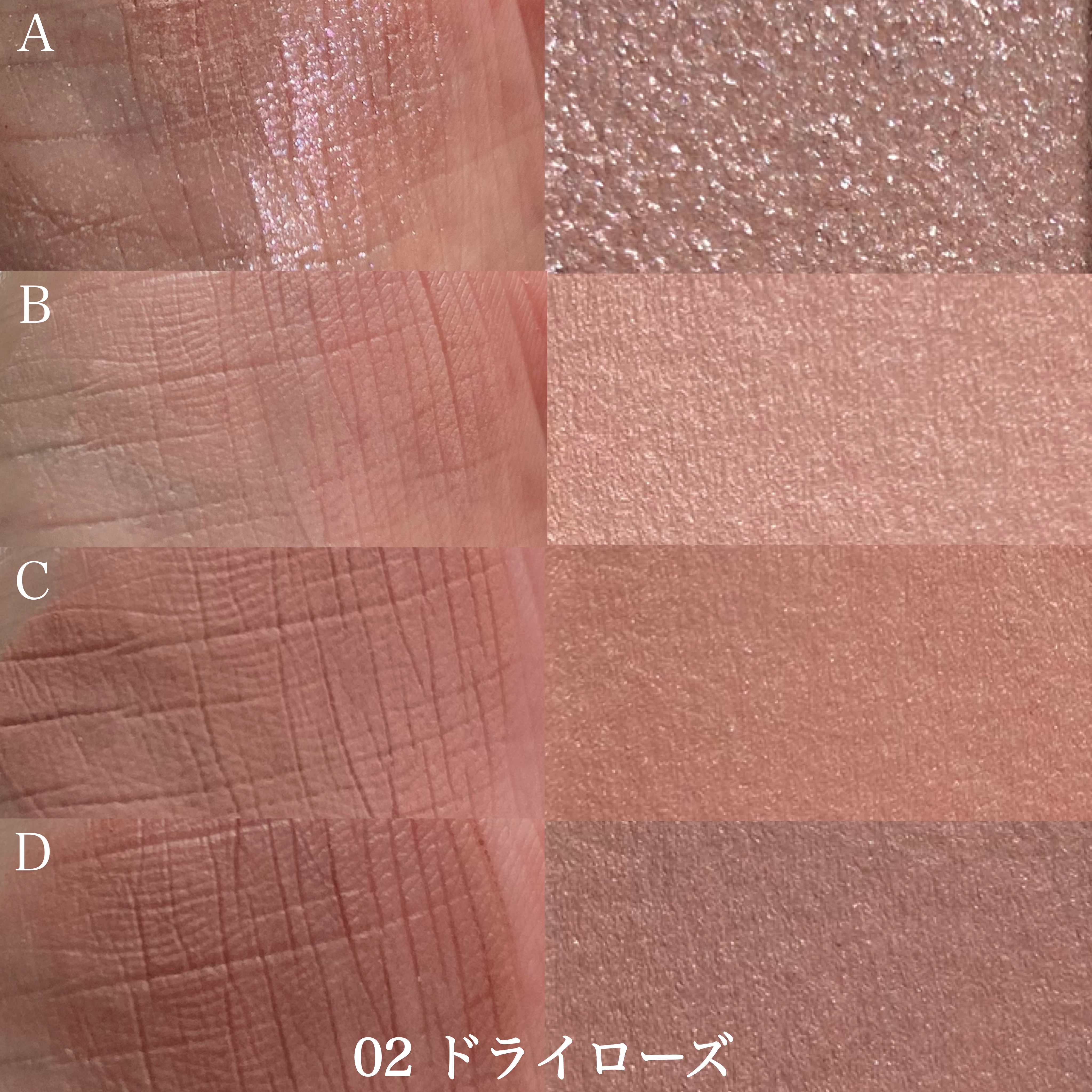 - 01 オレンジガナッシュ A:ジメチコン、タルク、トリ(カプリル酸/カプリン酸)グリセリル、(ジメチコン/ビニルジメチコン)クロスポリマー、カルナウバロウ、クロルフェネシン、デヒドロ酢酸Na、ラウロイルリシン、トコフェロール、スクワラン、ホホバ種子油、マイカ、ホウケイ酸(Ca/Al)、酸化チタン、酸化鉄、酸化スズ、シリカ B・C・D:タルク、リンゴ酸ジイソステアリル、ジメチコン、ジエチルヘキサン酸ネオペンチルグリコール、シリカ、ヘキサ(ヒドロキシステアリン酸/ステアリン酸/ロジン酸)ジペンタエリスリチル、クロルフェネシン、デヒドロ酢酸Na、水酸化Al、セスキイソステアリン酸ソルビタン、ミリスチン酸亜鉛、トコフェロール、スクワラン、ホホバ種子油、マイカ、酸化鉄、酸化チタン、赤226、硫酸Ba 02 ドライローズ A:ジメチコン、タルク、トリ(カプリル酸/カプリン酸)グリセリル、(ジメチコン/ビニルジメチコン)クロスポリマー、カルナウバロウ、クロルフェネシン、デヒドロ酢酸Na、ラウロイルリシン、トコフェロール、スクワラン、ホホバ種子油、マイカ、ホウケイ酸(Ca/Al)、酸化チタン、酸化鉄、酸化スズ、グンジョウ B・C・D:タルク、リンゴ酸ジイソステアリル、ジメチコン、ジエチルヘキサン酸ネオペンチルグリコール、シリカ、ヘキサ(ヒドロキシステアリン酸/ステアリン酸/ロジン酸)ジペンタエリスリチル、クロルフェネシン、デヒドロ酢酸Na、水酸化Al、セスキイソステアリン酸ソルビタン、ミリスチン酸亜鉛、トコフェロール、スクワラン、ホホバ種子油、マイカ、酸化鉄、酸化チタン、赤226、硫酸Ba、グンジョウ 03 ビスケットブラウン A:ジメチコン、タルク、トリ(カプリル酸/カプリン酸)グリセリル、(ジメチコン/ビニルジメチコン)クロスポリマー、カルナウバロウ、クロルフェネシン、デヒドロ酢酸Na、ラウロイルリシン、トコフェロール、スクワラン、ホホバ種子油、マイカ、ホウケイ酸(Ca/Al)、酸化チタン、酸化鉄、酸化スズ B・C・D:タルク、リンゴ酸ジイソステアリル、ジメチコン、ジエチルヘキサン酸ネオペンチルグリコール、シリカ、ヘキサ(ヒドロキシステアリン酸/ステアリン酸/ロジン酸)ジペンタエリスリチル、ミリスチン酸亜鉛、クロルフェネシン、デヒドロ酢酸Na、水酸化Al、セスキイソステアリン酸ソルビタン、トコフェロール、スクワラン、ホホバ種子油、マイカ、酸化鉄、酸化チタン、硫酸Ba