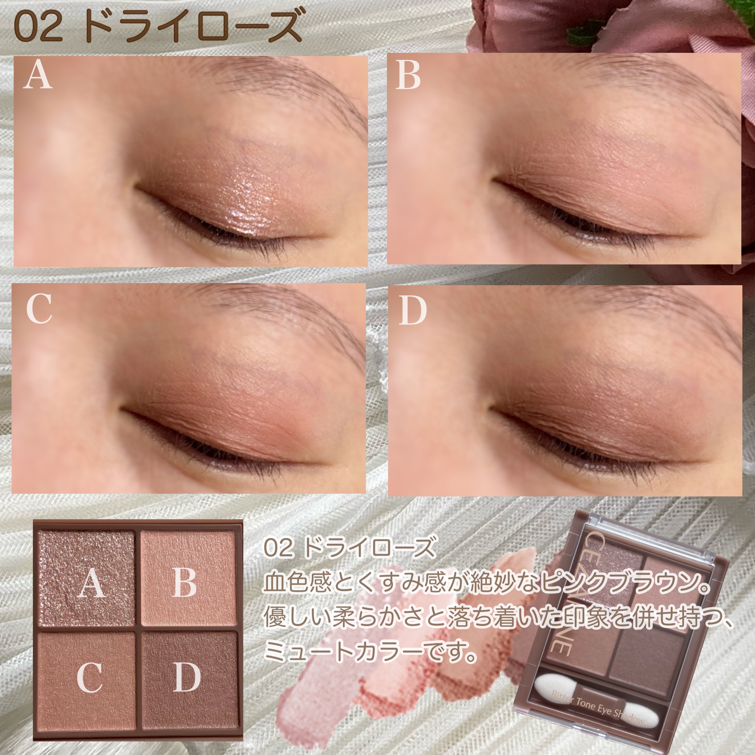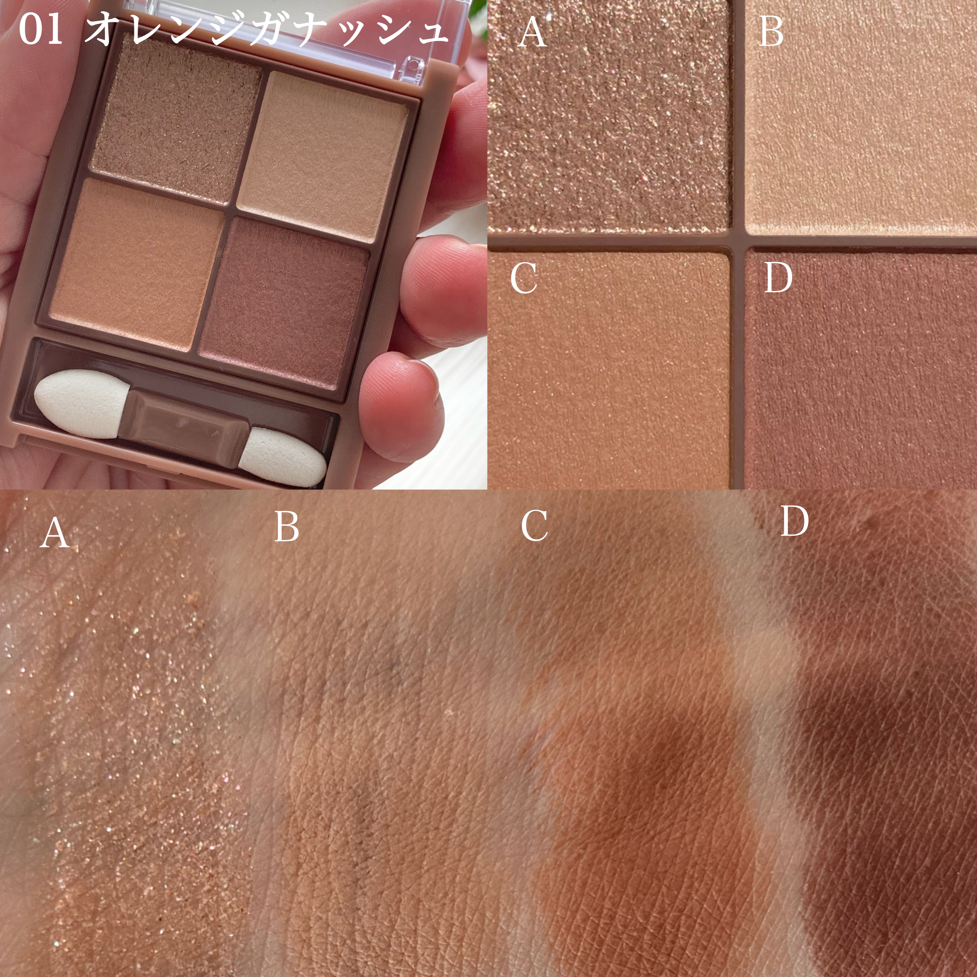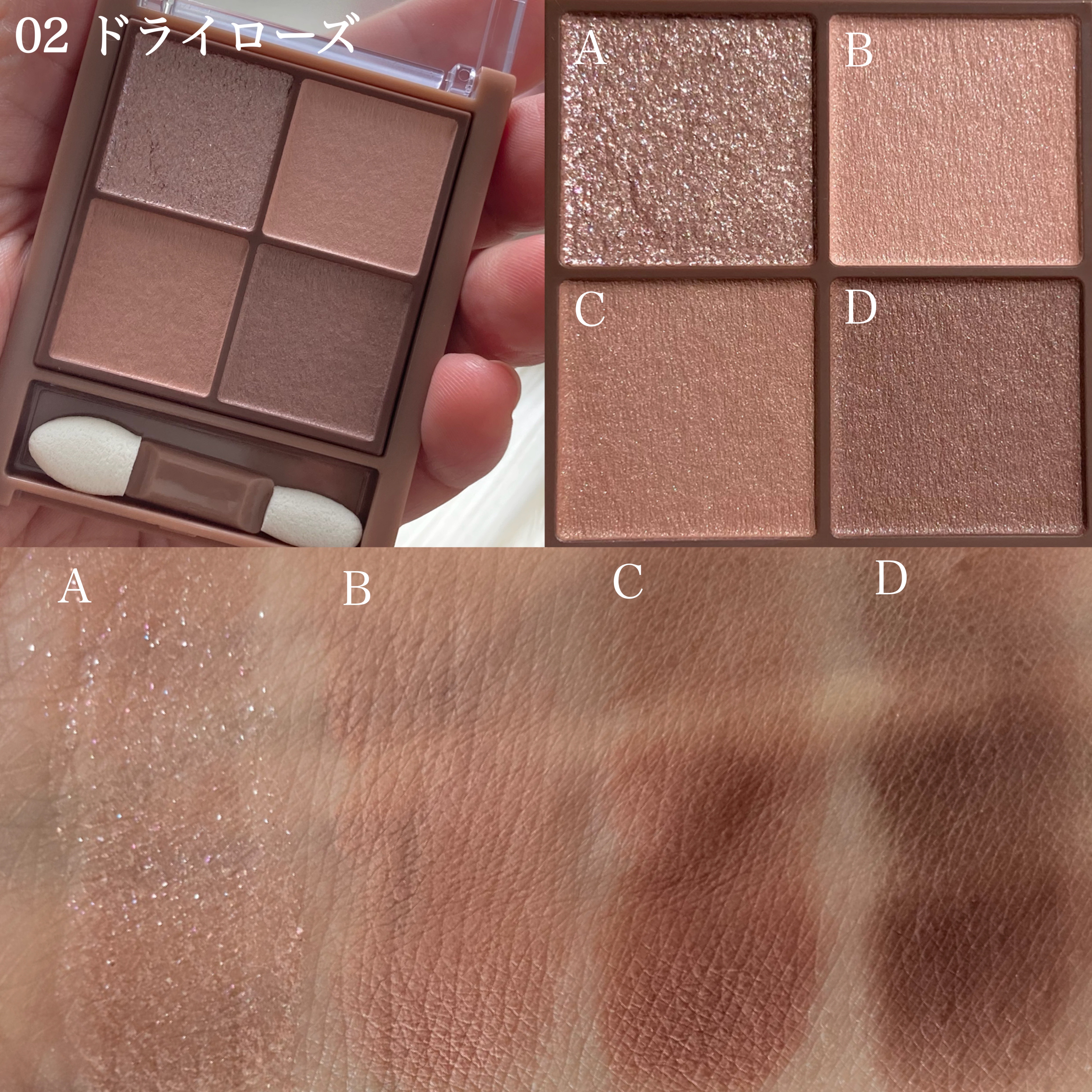- 透け感マット×濃厚ブラウンの4色アイシャドウ。 しっかり目元を引き締めるビターなブラウンカラー。 透け感のあるブラウンを重ねて、自然な陰影のある目元へ。 ふんわり柔らかなパウダーなので、スルスル伸びてまぶたにピタッと密着。 保湿成分(スクワラン、ホホバ種子油)配合。