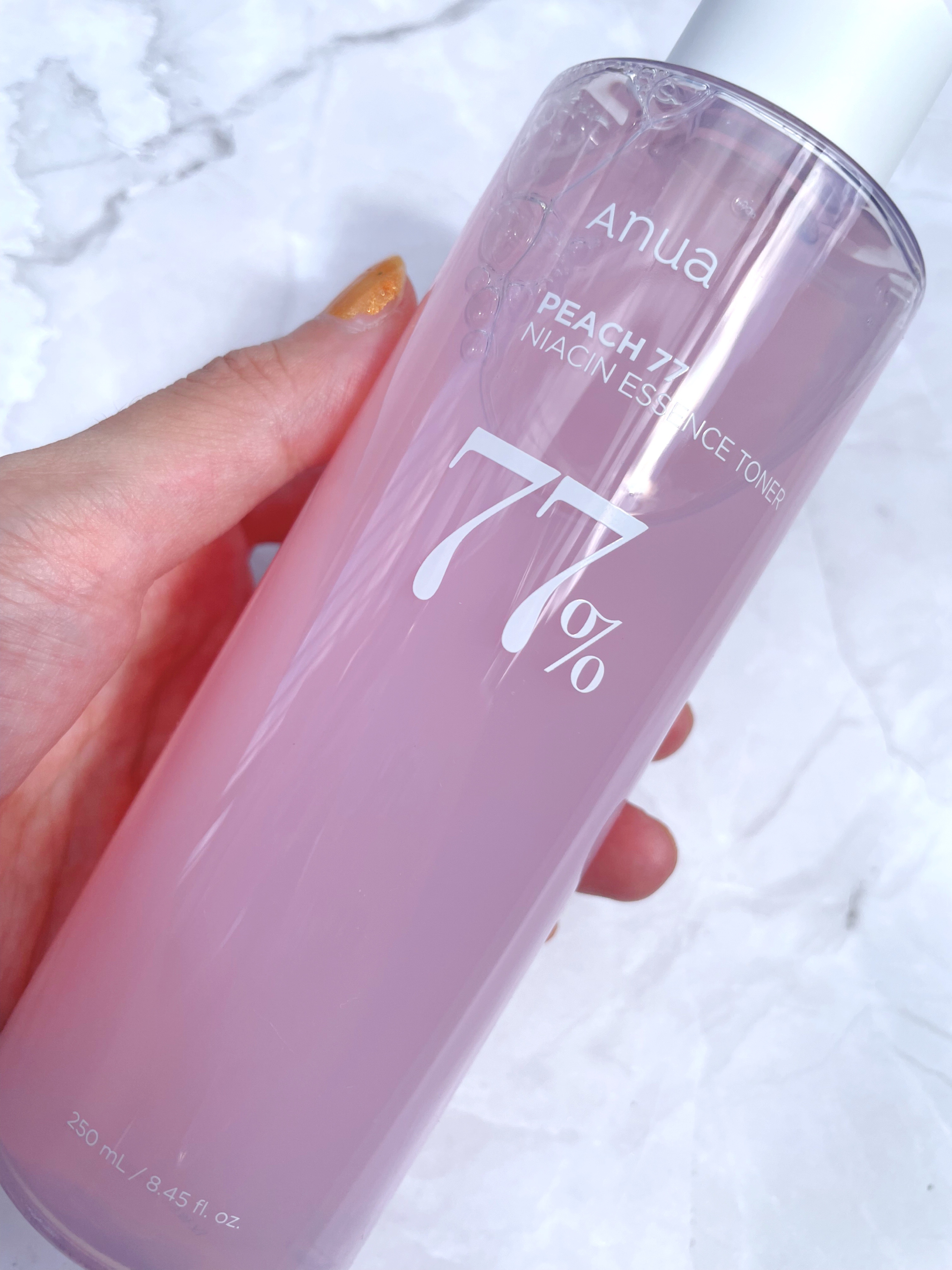 桃77% ナイアシンエッセンストナー 250ml 少しとろみのある液だけど、塗るとさっぱりしているので朝にとってもおすすめです🫧 桃の香りがする美容液です🍑 朝にも使いやすいさっぱりとした使用感です! トナーもセラムも全体的に効果がすごくあるわけではない気がするので、リピはしないかもですが桃の香りが好きな方、さっぱりした使用感が好きな方におすすめです🐨💭