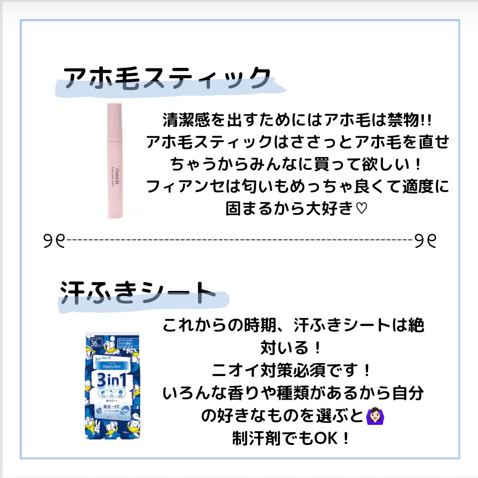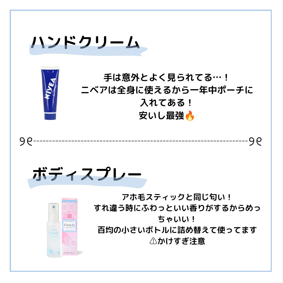 私はSHEINのを使ってます安くて可愛いのが沢山あるので愛用中♡レビュー必須です! ジップロックや百均の小さいケースに入れるのがオススメ! フィアンセを愛用中です♡匂いも最高👍🏻 ハッピーデオはディズニーデザインで冷たくなって好き! イニスフリーとかもオススメです👍🏻 できるだけナチュラルなものがいいです! 百均の小さいスプレーボトルに入れるのが🙆🏻♀️