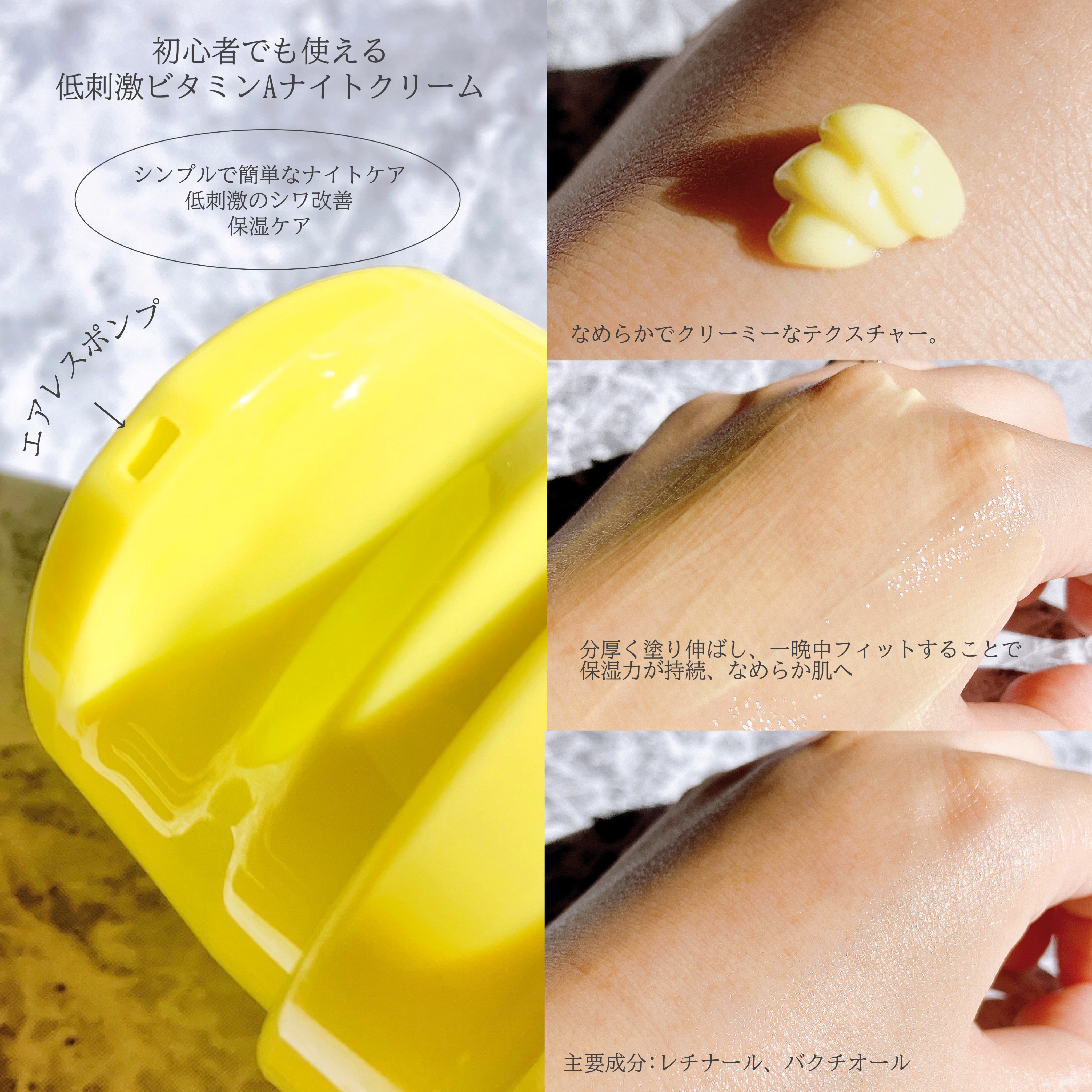 レチナールとバクチオールで肌のキメや毛穴、保湿に役に立つ ウェル・エイジングクリーム⟡.· レチノールより刺激が少ないので敏感肌さんにも優しいクリーム♩¨̮ 黄色のクリームでスルスル伸びが良くて塗り心地も良い♡ 保湿効果もあってしっとりとした仕上がり⟡.·