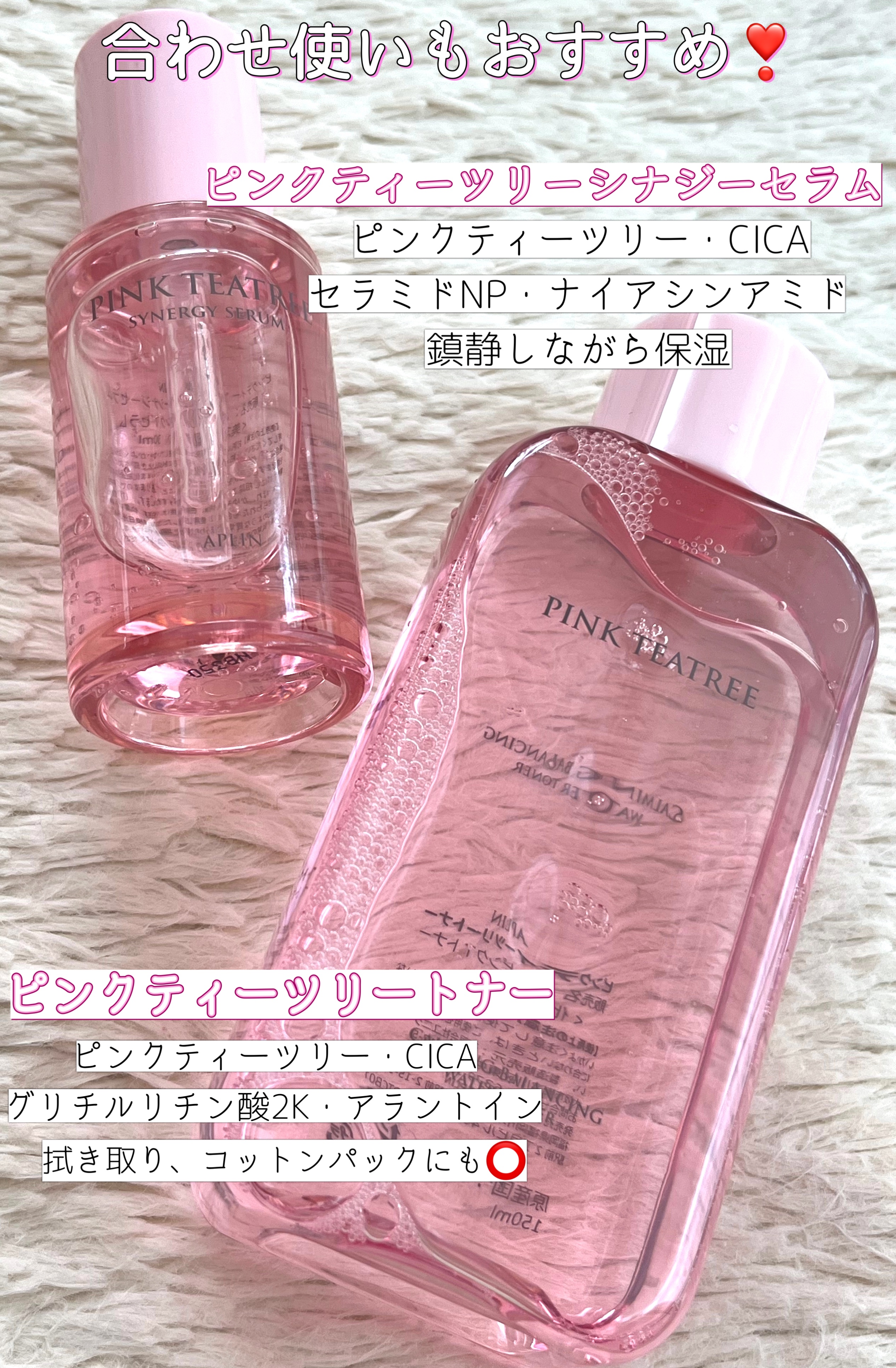 APLINのピンクティーツリートナーは何回リピしたかわからないくらい使ってます! この化粧水と美容液使ってる時はほんとニキビ出来にくくてニキビがあったとしてもシカ配合だからニキビ鎮静して大人しくしてくれる😭 サラサラでベタつかないのに保湿力高いから油分でニキビできるタイプの混合肌さんにもおすすめです!