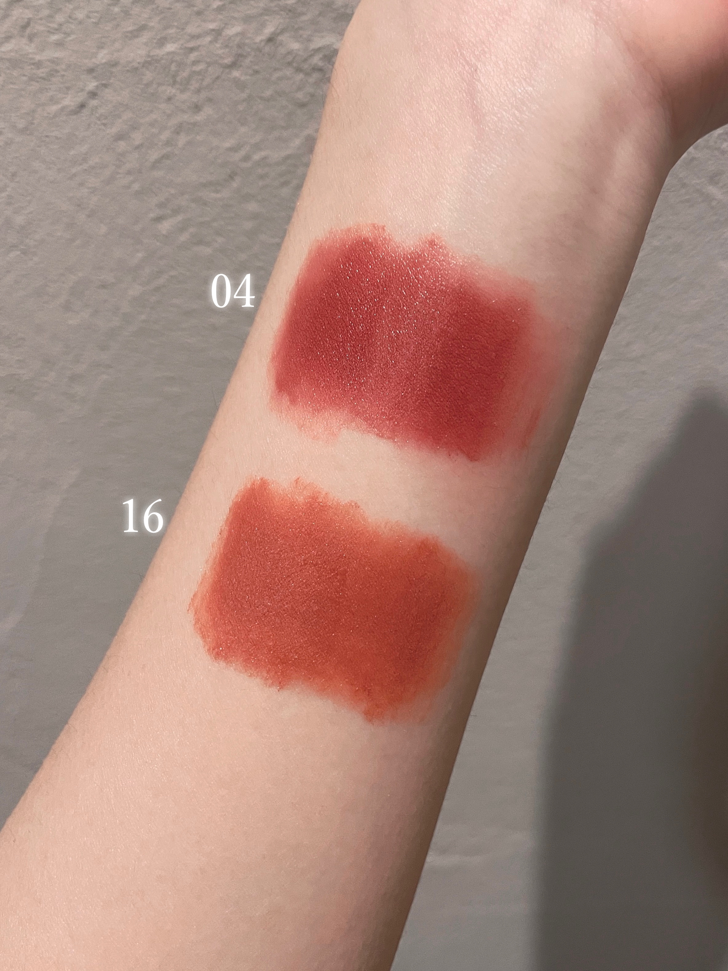 塗った瞬間、「あ、これ唇乾燥しないタイプだ!」って思いました。 04のカラーは薄く塗れば可愛らしいピンクに、濃く塗れば赤みがある大人っぽいピンクになりました。 16のカラーは、説明にはヌーディーピンクと書かれていたのですが、実際はピンクというよりオレンジが強めのヌーディーカラーでした。 唇に乗せるとピンク味がプラスされてめちゃくちゃ可愛い色に…♡