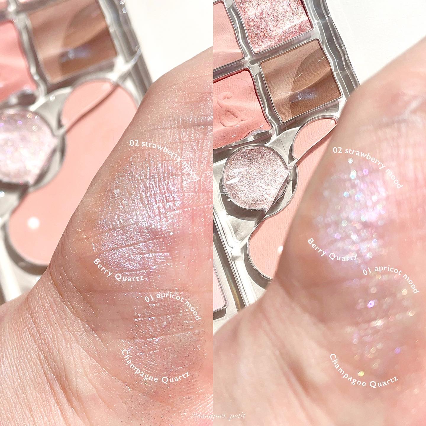 先ずこれは4カラー全てに言えることですが、指で直塗りしちゃうとギランギランになるので、ブラシでふわっとのせるのが良いです。 02はグリッターのような輝きのある、ハイライターというより大粒ラメ。 04は偏光ピンクパールが可愛すぎる🩷 粉質はどれも柔らかいので使いやすいですよ! 私個人としては1番使いやすいのは04です。 ラメが非常に細かい+ 偏光ピンクカラーが上品な艶感を演出。 02に関しては、fweeのダイヤモンドチークと似ていて、ラメが大きくシルバー系の輝きのため、涙袋用のブラシで目頭等にのせています。 03はチークとして使ってます。 チークにラメが入っていると考えれば、時短です笑 コーラル系ピンクですが、ブルベでも可愛く発色しましたよ❤️