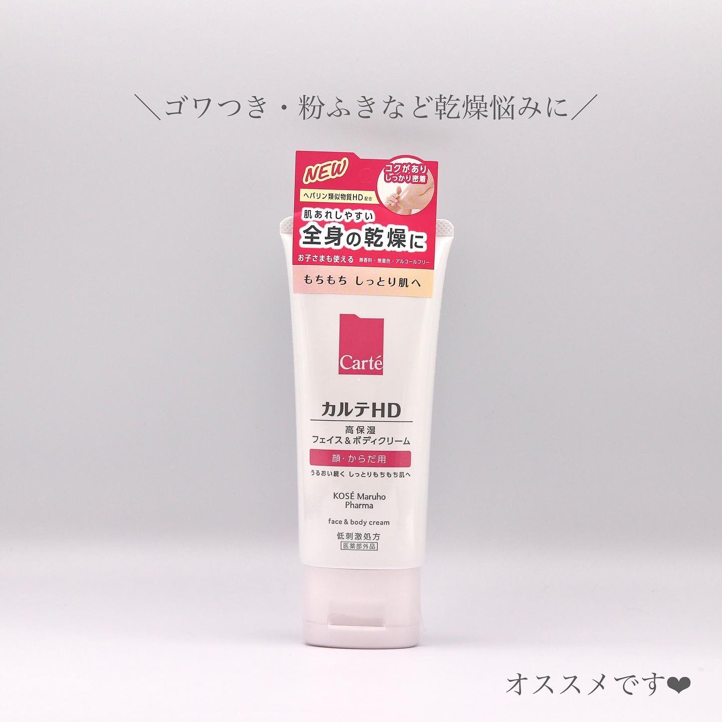 - 【全身用高保湿クリーム】 コーセーとマルホの合弁会社コーセーマルホファーマから発売された「カルテHD」。マルホから唯一供給を受けた「ヘパリン類似物質HD」を配合。 ゴワついたあれがちな肌にもピタッと密着、もっちりなめらか肌に導く全身用高保湿クリーム。 ひじ・ひざ・かかとなど気になるパーツにもピタッと密着してシールドできる「ワセリン」や「ピタッと保護膜オイル」を高配合。 それでいてのびの良いオイルとバランスよく組み合わせているから、腕やすねなどの広い範囲にもスーッと軽やかにのばせます。 フェイス&ボディローションと共通の「肌やわらかオイル」も配合。 濃厚なうるおいで肌をしっかり包み込みながらべたつかない使い心地です。