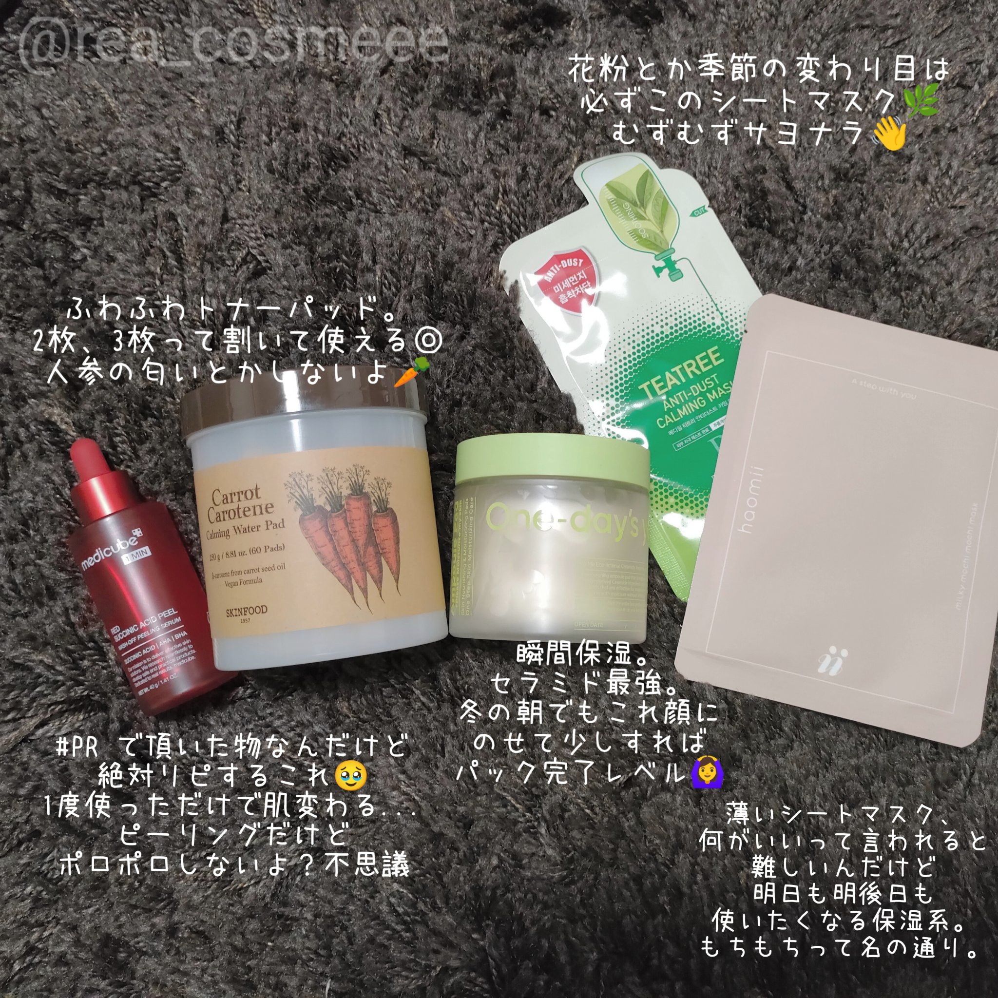 どれもいちご鼻が改善されることはなかったけど💭拭き取りトナーパッドとしてはどれもヒタヒタで使いやすいです😌 毛穴ゼロたまご肌トナーパッド これは4つの中なら1番お気に入り。メイク前はこれでちゃちゃっと拭き取ってあげたら保湿もできて肌がゴワゴワしないからウロコみたいな浮き方もしてこなくなったからお気に入り😌 成分が簡潔なのが私はとっても好きです😌成分表を見ると、しっかり鎮静やニキビに効果があるんだろうな〜って思いました。