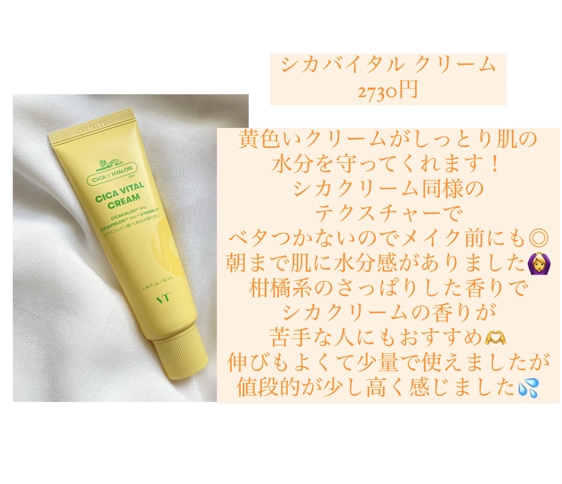肌の状態やその時の状況に合わせて組み合わせて使うまでいました! クリームはベタつかないのでメイク前に使用しても化粧ノリやヨレなど問題なかったです◎ 使っている期間、肌トラブルは全くなかったです👏 シカ特有のハーブっぽい香りが苦手だったり、シカだけじゃなくビタミンも補給したい場合はこちらのバイタルシリーズがおすすめです🫰 柑橘系のさっぱりした香りがこの時期にぴったりでした🍋