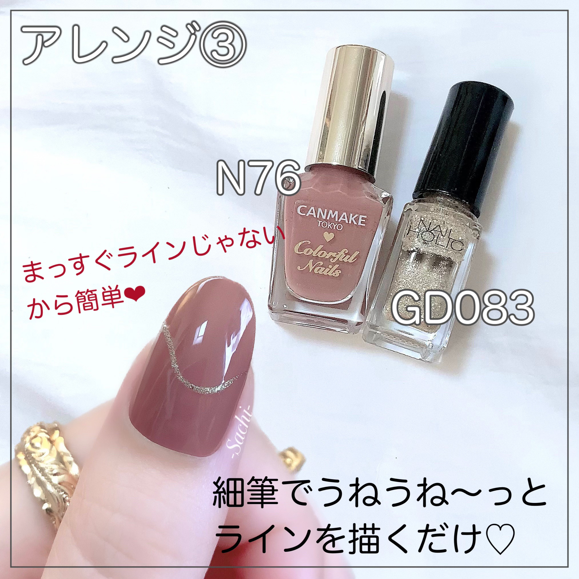 ワンカラーでも指ごとに色を変えるだけでオシャレに見えます💕 画像のようにゴールドラインとストーンを少し足すだけで華やかさがアップ🥰 何度かご紹介したことのあるスポンジで作るグラデーションです✨ スポンジを使うことで境目が綺麗に馴染んでくれます💕 アルミホイルの上でブラウンとトップコートを1:1くらいで混ぜたものを、トップコートのハケに取って3箇所に塗るだけ👌 事前に混ぜたものを塗ることで、爪の上でぼかすより簡単に出来ます💕 ベースカラーが乾く前に点置きしてぼかすことで綺麗にぼかせます✨ スピードが大事なので、使うポリッシュのキャップは全て開けておきましょう😊 天然石のラインはガタガタの方がより天然石っぽく見えるので、ラインを描くのが苦手な方でも大丈夫🙆♀️ 難しそうに見えて、やってみると意外と簡単に出来ます♡