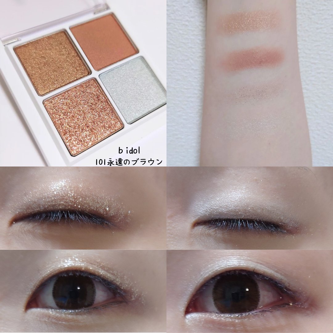 bidol THEアイパレR101永遠のブラウン ¥1,980まだ在庫があると聞いて買ってみました!※2025/4/20時点 まだ売ってました左上:ゴールドパール入り 明るめブラウン右上:マット 黄み少なめブラウン左下:グリッター 色は乗らず...