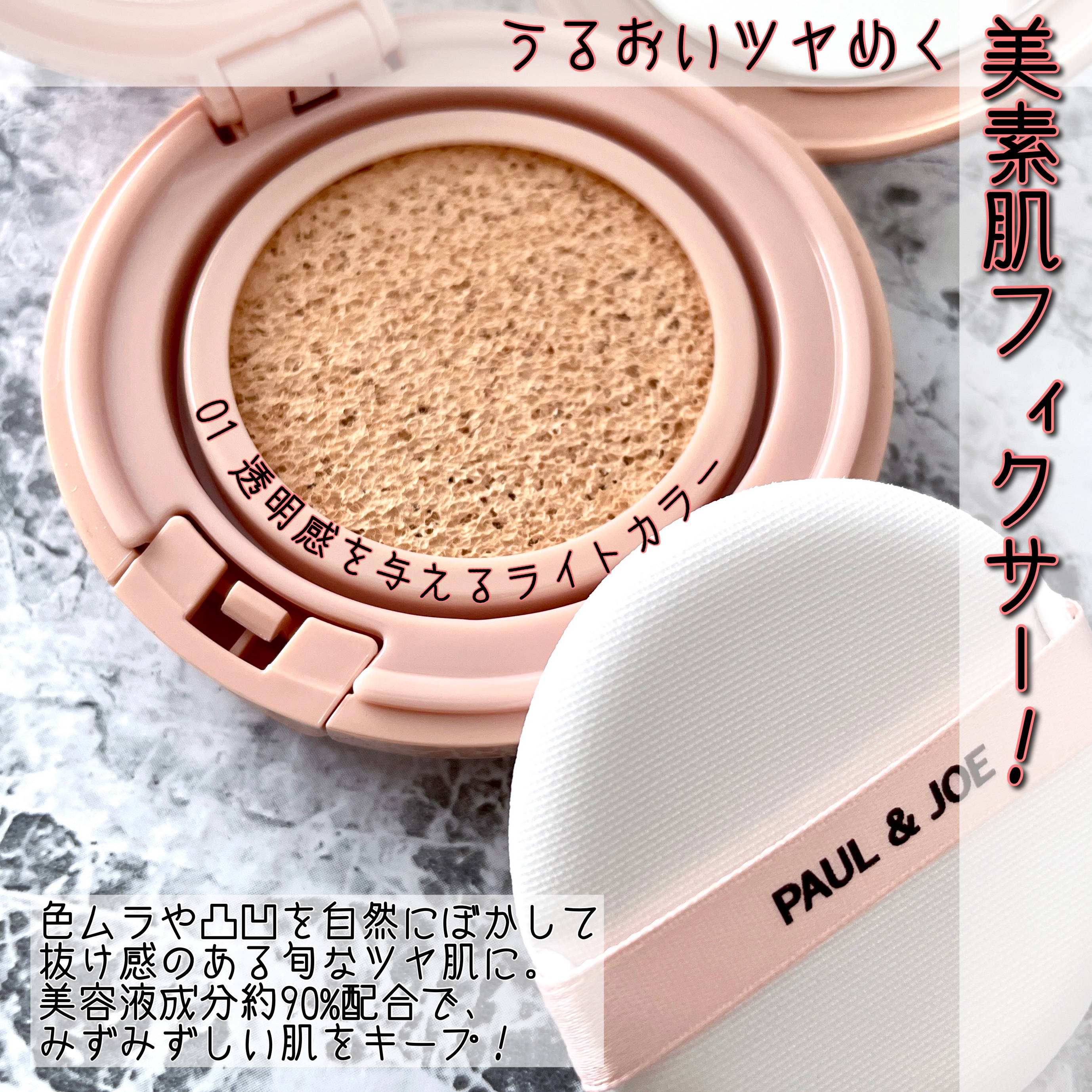 - うるおいツヤめく“美素肌フィクサー”。 美容液成分約90%、 オールインワン・クッションコンパクト。 ・化粧下地・ファンデーション・スキンケア効果を兼ね備えた、ポール & ジョー初のオールインワン・クッションコンパクト。つくりこまず素肌を活かす絶妙な補整効果で、抜け感のある美素肌に仕上げます。テクニックレスでどなたでも簡単に美しく仕上げることができます。 ・ぼかしフィルター(スクレジェル)*¹ の効果で毛穴、肌の凹凸、くすみ、色ムラをふんわりとぼかしてなめらかに整えます。素肌を活かした抜け感のある旬なツヤ肌に。 ・モイスチュアエッセンス*² やモイスチュアオイル*³、3種のヒアルロン酸*⁴ など美容液成分を約90%以上配合することで、うるおいを逃がさずキープ。みずみずしい使用感で、ポール & ジョーのベースメイクの中でも最高レベルのリッチなうるおい感に。 ・うるおいを抱え込んだ柔軟なジェル膜が肌と一体化するように心地よく密着し、崩れにくい肌をキープ。シワにも入りにくく、乾燥によるくずれを防ぎます。膜同士がなじみやすいので、気になる部分の重ねづけや日中のお直しも美しく仕上がります。 *¹ カルボマーNa *² シロキクラゲエキス *³ ジカプリン酸PG *⁴ アセチルヒアルロン酸(アセチルヒアルロン酸Na)、加水分解ヒアルロン酸、ヒアルロン酸(ヒアルロン酸Na) (全て保湿)