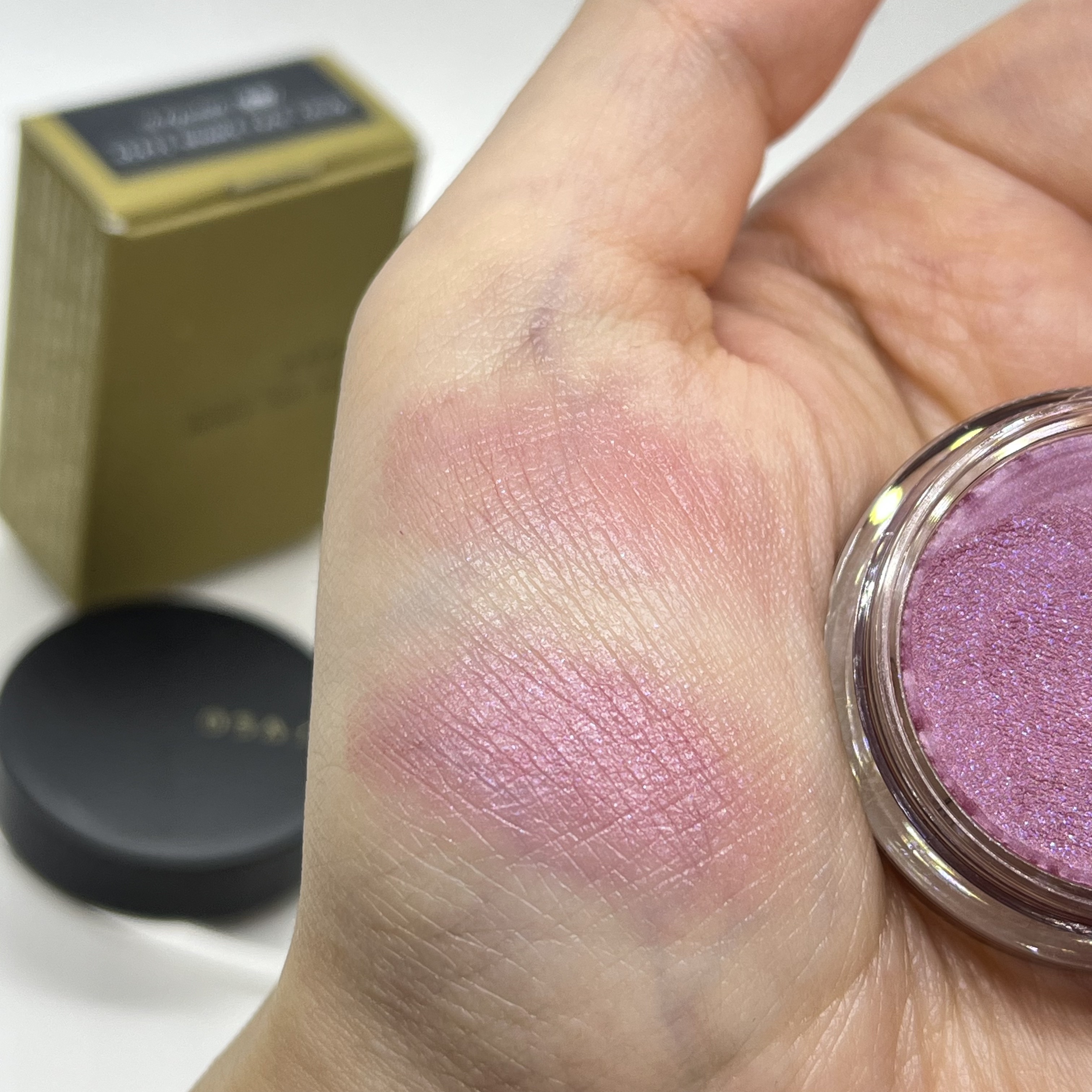 チークポップ持ってる人なら分かると思いますが、パール感は強め。 指で濃いめにつけてるので実際ブラシにとってつけるともっと薄めでモーヴカラー。 白っぽいパールなので見た目より明るめの発色。