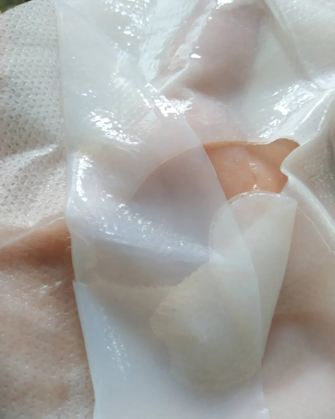 肌トラブルを防ぐ成分が配合。 ココナッツウォーターを主成分とした植物繊維に発酵技術を⽤いられて作られたバイオセルロースを使⽤。美容液25mLたっぷりの濃密マスクなんです。 不織布シートに挟まれたナタデココのようなプルンっとした肌触りのいいバイオセルロースマスクがひんやりとっても気持ちいい😊 肌触りもベタつかず、しっとりするような優しいつけ心地。