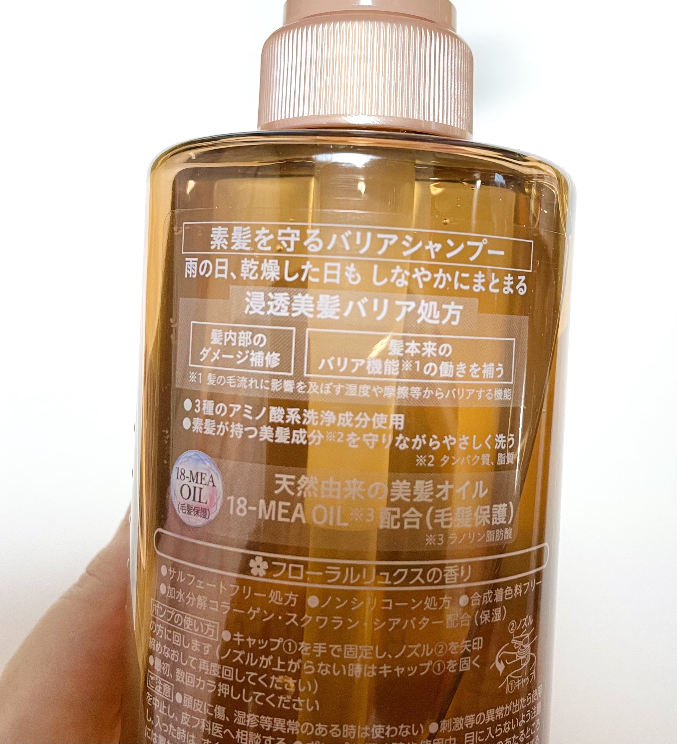 - うる髪続くバリアシャンプー・コンディショナー 雨の日、乾燥した日も しなやかにまとまる 【バリアシャンプー・コンディショナー共通】 ●浸透美髪バリア処方 ・髪内部のダメージ補修 ・ 髪本来のバリア機能*の働きを補う *髪の毛流れに変化を及ぼす湿度・摩擦等からバリアする機能 ●天然由来の美髪オイル 18-MEA OIL*配合(毛髪保護)*ラノリン脂肪酸 ●サルフェートフリー処方 ●合成着色料フリー ●加水分解コラーゲン・スクワラン・シアバター配合(保湿) ✿フローラルリュクスの香り 【バリアシャンプー】 ●3種のアミノ酸系洗浄成分使用 ●とろふわスフレ泡で素髪が持つ美髪成分*を守りながらやさしく洗う *タンパク質、脂質 ●ノンシリコーン処方 【バリアコンディショナー】 ●傷んだ髪を集中補修&コート ●湿度や摩擦等の外部刺激から髪を守る ●セラミドES*配合(補修)*ビスメトキシプロプルアミドイソドコサン