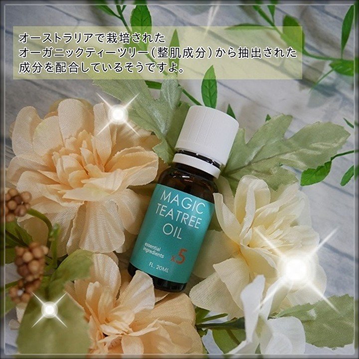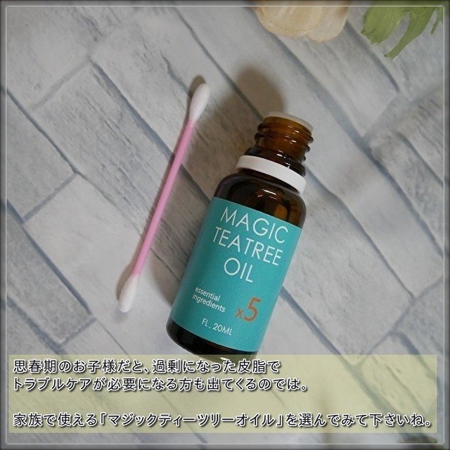 - マジックティーツリーオイルは、乾燥や皮脂による肌悩みをスポットケアし、整える商品です。ブラン代表の整肌成分である4‐テルピネオールで肌トラブルの原因の1つである皮脂を素早くケアします。 【このような方におススメ】 ✔乾燥による肌悩みが気になる方 ✔過度な皮脂と油分が気になる方 ✔べたつきのないスキンケアを探されている方 ✔肌荒れを防ぎたい方 ✔年齢性別肌タイプ関係なく使用できる商品を探されている方 【使用方法】 ①洗顔後、コットンに適量を取り、軽くふき取った後馴染ませます。 ②気になる部分の肌をきれいに洗顔後、トナー→クリームの順でお肌を整えます。 ③綿棒に1~2滴落とし、気になる部分に塗ります。 経過を見て朝晩のスキンケアの最後の段階に塗ることを繰り返します。