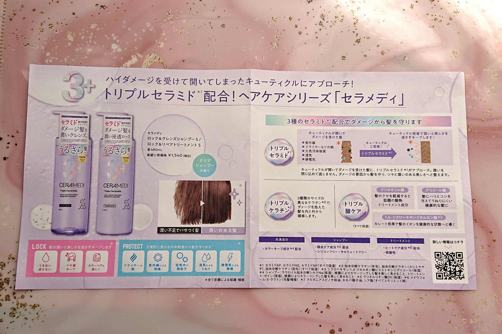 - ハイダメージを受けて開いてしまったキューティクルにアプローチ。 トリプルセラミド※1 配合。ヘアケアシリーズ「セラメディ」 ▼ドライヤーの熱や摩擦、紫外線ダメージホコリなどの汚れやギシギシ感、湿度によるうねり。「セラメディ」は、これらのダメージによるキューティクルの開きに着目。 トリプルセラミド※1 がハイダメージを受けた髪にツヤと潤いを与え、ダメージから髪を守ります。 ▼キューティクルが開いてダメージを受けた髪に、トリプルセラミド※1 が潤いを閉じ込めて逃がさず、3種類のサイズの異なるケラチン※2 が、ダメージを抱えた髪を内と外から補修。トリプル酸 ケア※3 で、健康的な髪へ。 ▼カラーキープ成分※4 配合。 ▼頭皮ケア成分※5 配合、シリコンフリー、サルフェートフリー。 ▼クリアシャンプーの香り。 ※1 セラミドAP、セラミドNG、セラミドNP(すべて保湿) ※2 加水分解ケラチン(羊毛)、加水分解ケラチン(カシミヤヤギ)、加水分解ケラチン(羽毛)(すべて保湿) ※3 グリオキシルサン、グリコール酸、1,4‐シクロヘキサンジカルボン酸※6 ※4 シャンプー:ラウロイル加湿分解シルクNa(保湿)、被膜によりカラーリングした髪を美しく見せること、トリ∸トメント:ゼイン(保湿)、被膜によりカラーリングした髪を美しく見せること ※5 グリチルリチン酸2K(保湿) ※6 シクロヘキサー,4カルボン酸ビスエトキシジグリコール(保湿) 2023/2/27 PLAZA先行発売