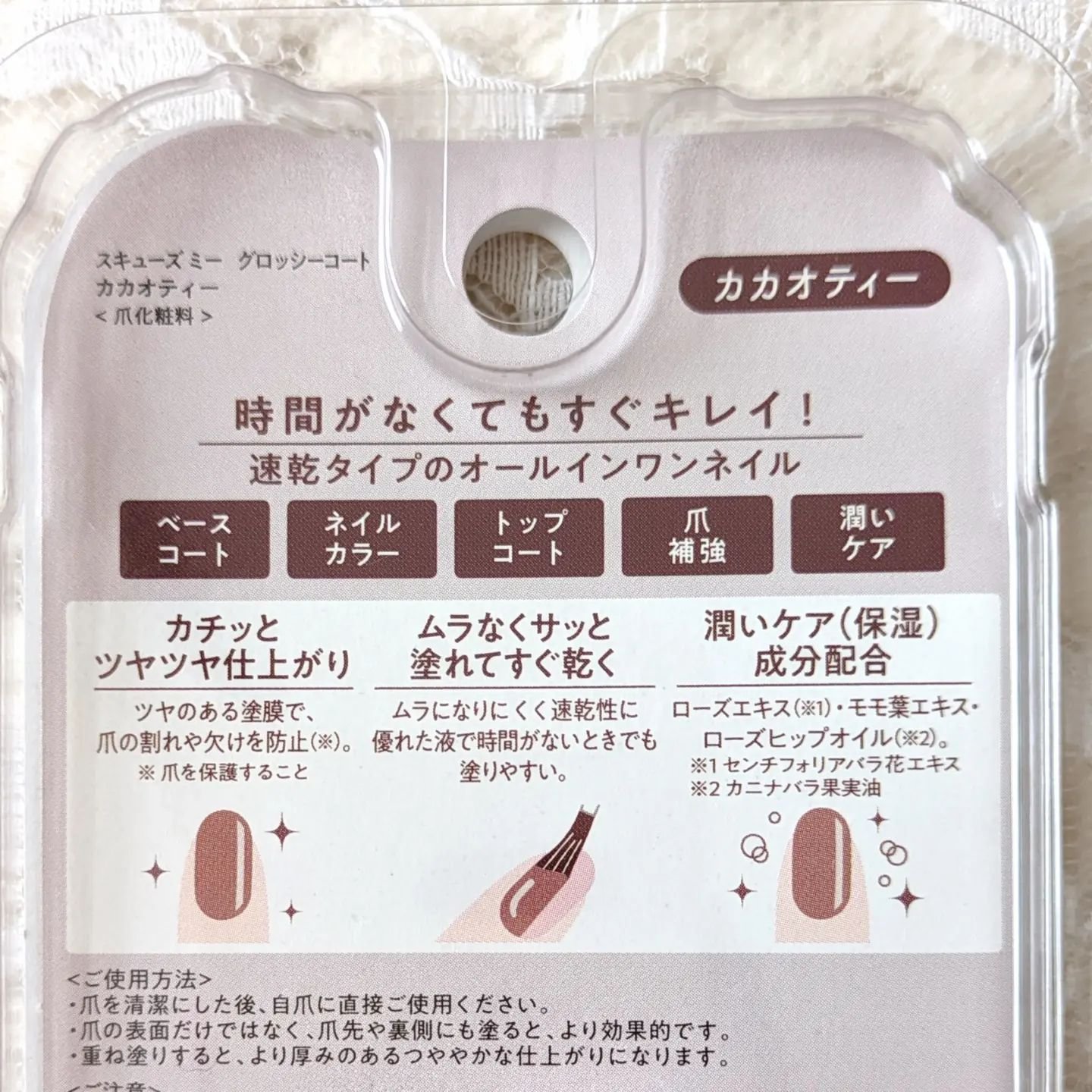 - ※2023年2月15日より、一部カラーのパッケージリニューアル。(「グレージュ」「モーヴピンク」 「ライラックピンク」「シアーラベンダー(数量限定)」「スキンベージュ」「ローズベージュ」) 速乾タイプのオールインワンネイル。1本でベースコート・ネイルカラー・トップコート・爪補強・潤いケア(保湿)の機能。 時間がなくても、すぐにキレイなネイルが完成。 1本でツヤツヤ美爪に仕上がる、速乾タイプのオールインワンネイルです。 1度塗りでほんのり透け感、2度塗りでしっかり発色。重ね方次第でお好きな発色が楽しめます。 【商品特長】 ●時短ができる 1本で、ベースコート・ネイルカラー※・トップコート・爪補強・潤いケア(保湿)の5つの機能。セルフネイルにかかる時間を大幅カットします。 ※「シアーラベンダー」はコントロールカラーとして ●カチッとツヤツヤ仕上がり ツヤと硬さのある塗膜が外部の刺激から爪を守り、割れや欠けを防止します。 ●ムラになりにくくサッと塗れてすぐ乾く ムラになりにくく速乾性の高い液なので、時間がない時でも塗りやすくストレスフリーにお使いいただけます。 ●潤いケア(保湿)成分 3種配合ローズエキス、モモ葉エキス、ローズヒップオイル(カニナバラ果実油)配合。