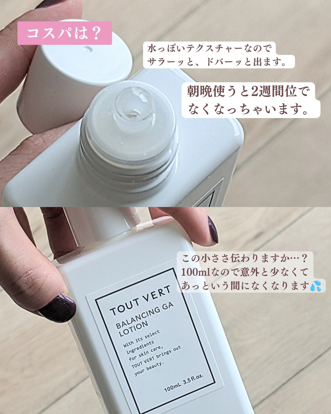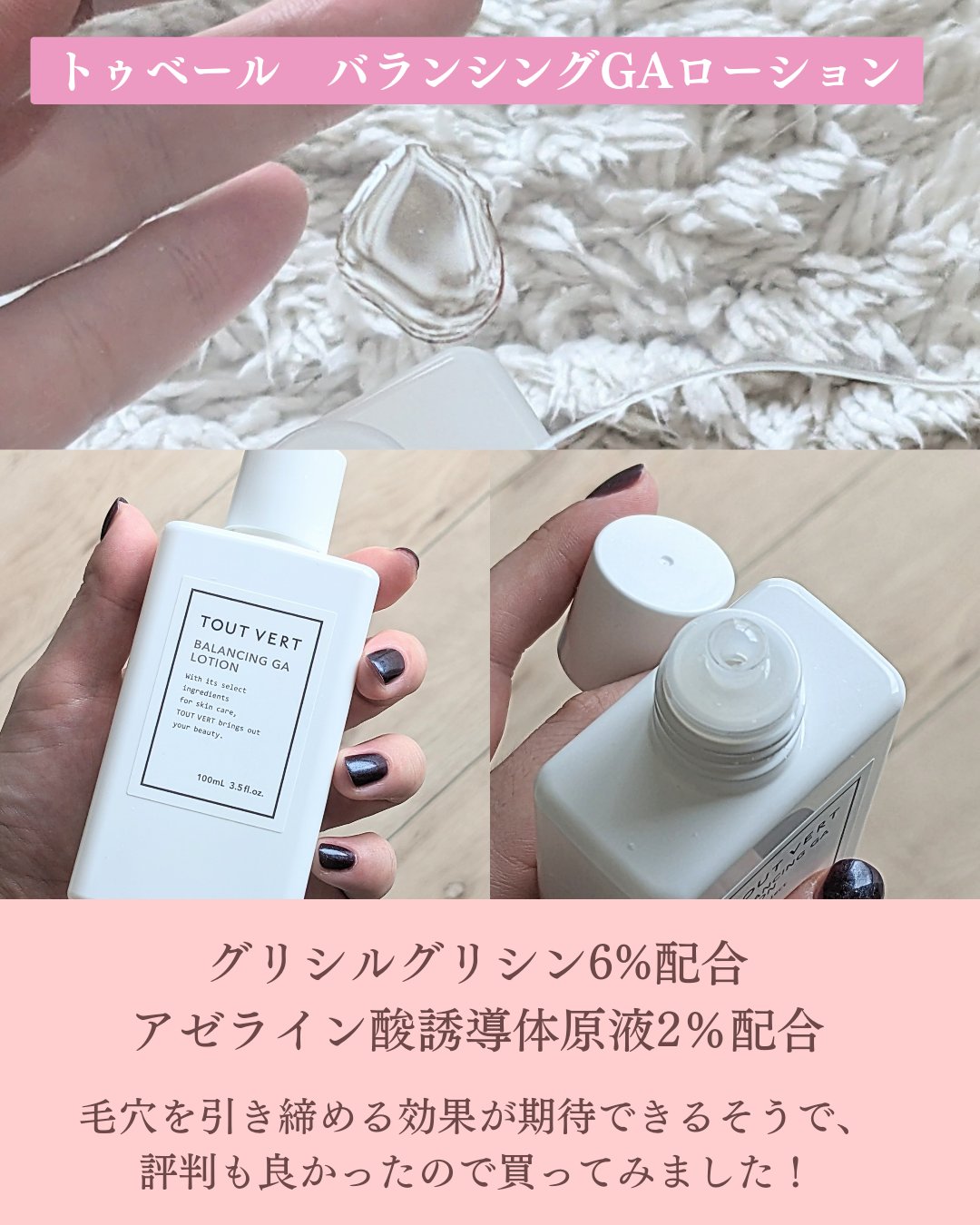 毛穴に効果がある?化粧水を使ってみた!*☼**☼*︎︎☁TOUTVERTバランシングGAローション100ml※プレ化粧水らしいですQoo10で購入しました!︎︎☁肌荒れ・皮脂トラブルをケアし、うるおいとキメを整える実力派成分☁グリシルグリシン...