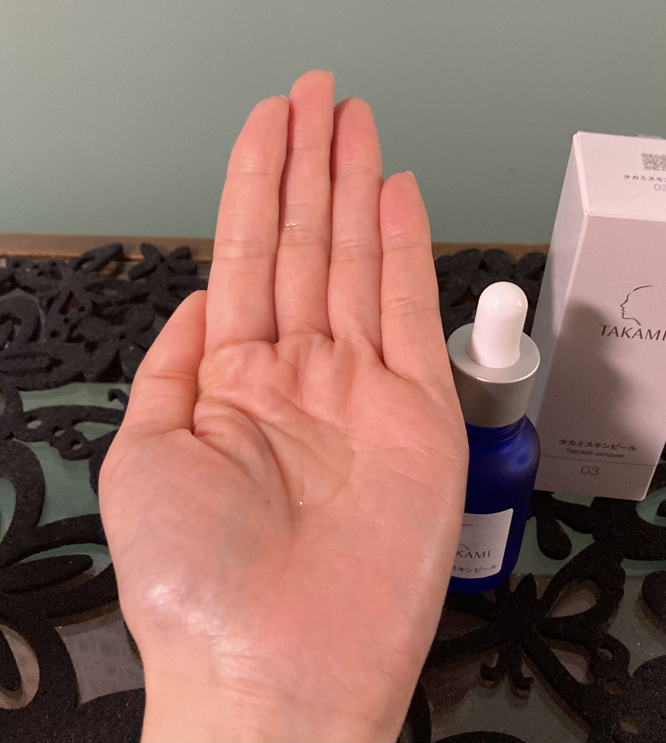 タカミスキンピールの容器は、本当に素敵なお色ですね この深いブルーのお色の容器は他では見かけないです 瓶入りの角質美容水で高級感もありますね こちらの角質美容水はスポイトタイプの容器 サラサラした液体なので付けやすいです 付け心地は少ししっとり、そしてすぐサラサラとした手触りになります
