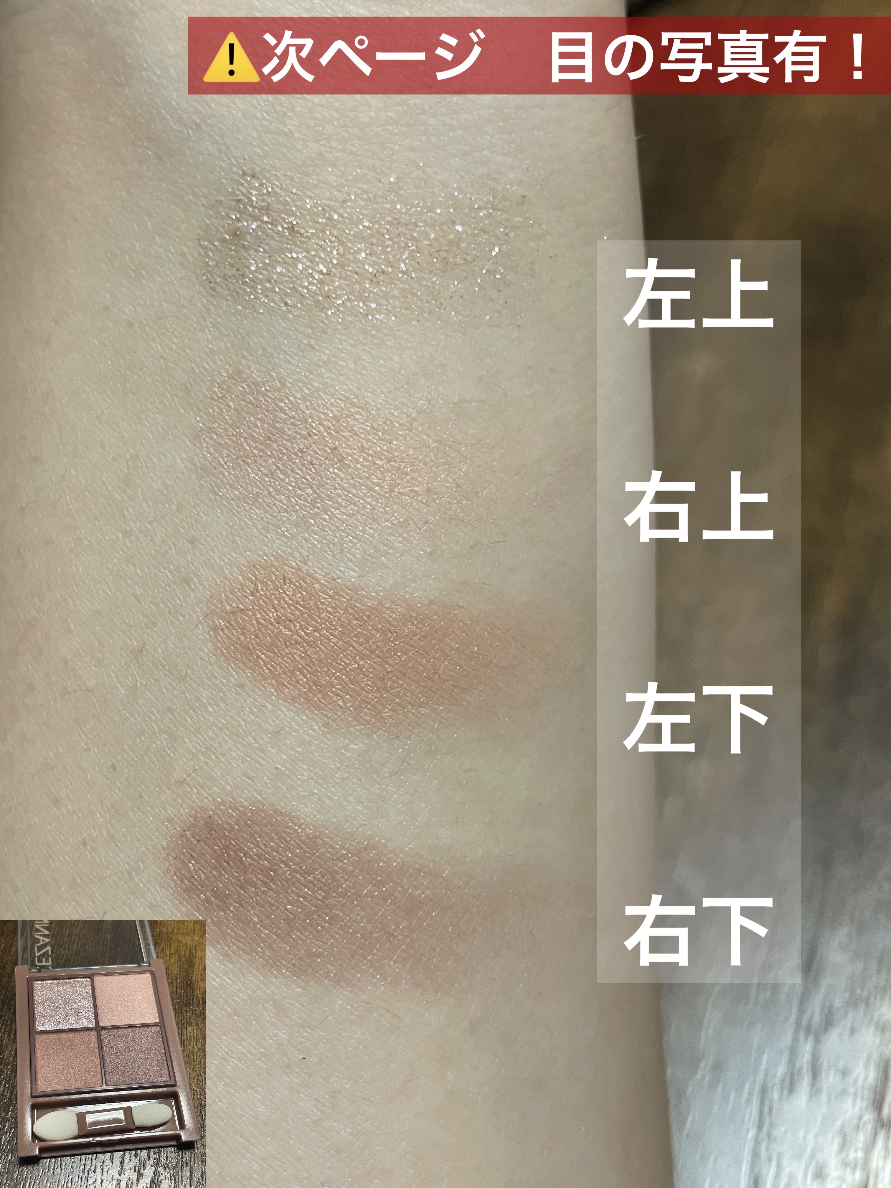 - 透け感マット×濃厚ブラウンの4色アイシャドウ。 しっかり目元を引き締めるビターなブラウンカラー。 透け感のあるブラウンを重ねて、自然な陰影のある目元へ。 ふんわり柔らかなパウダーなので、スルスル伸びてまぶたにピタッと密着。 保湿成分(スクワラン、ホホバ種子油)配合。