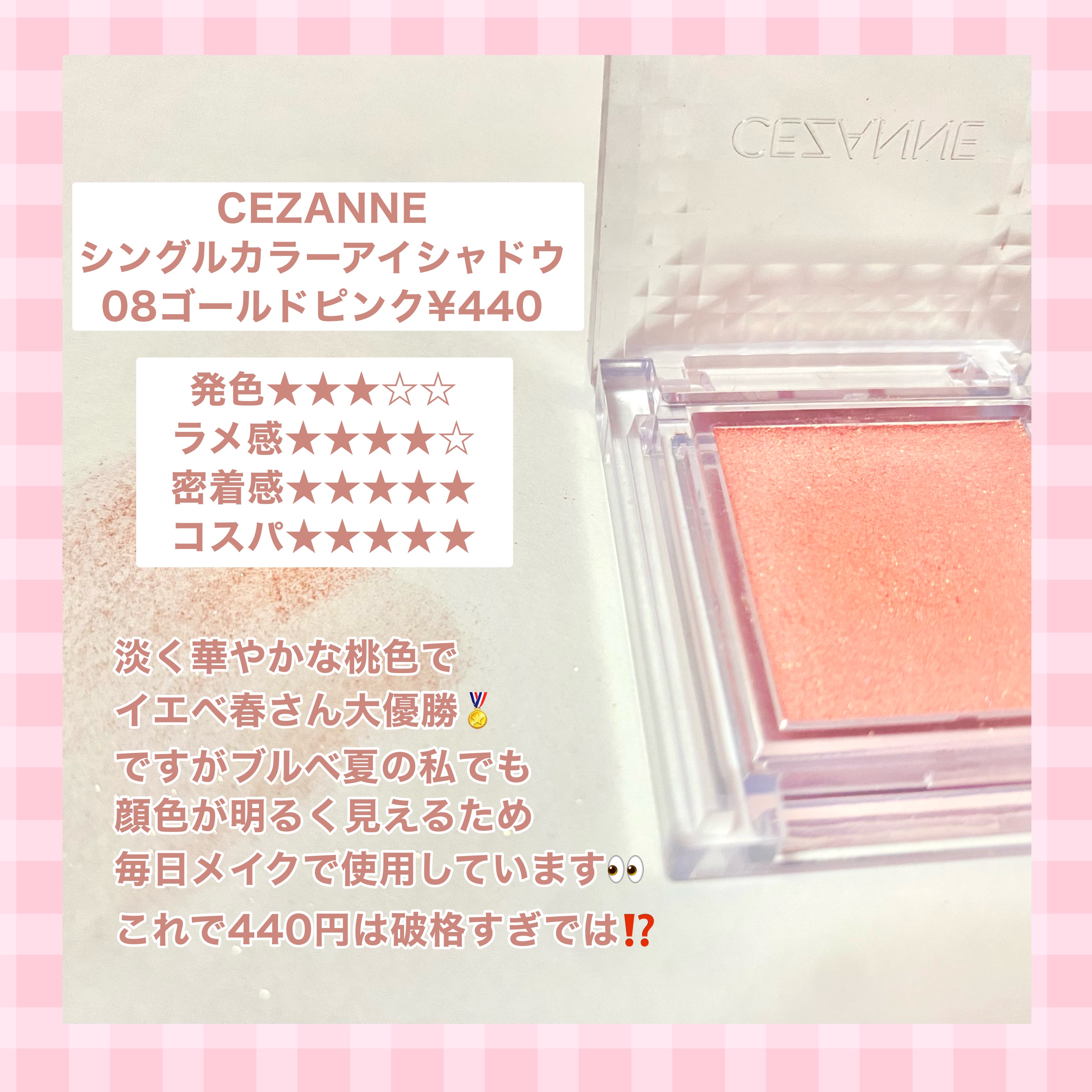 CEZANNEシングルカラーアイシャドウ08ゴールドピンク¥440✼••┈┈••✼••┈┈••✼••┈┈••✼••┈┈••✼コーラルピンク×ゴールドラメ✨️ゴールドのラメがたっぷりでとても綺麗です粉質もしっとりとしていて塗りやすいです440円...