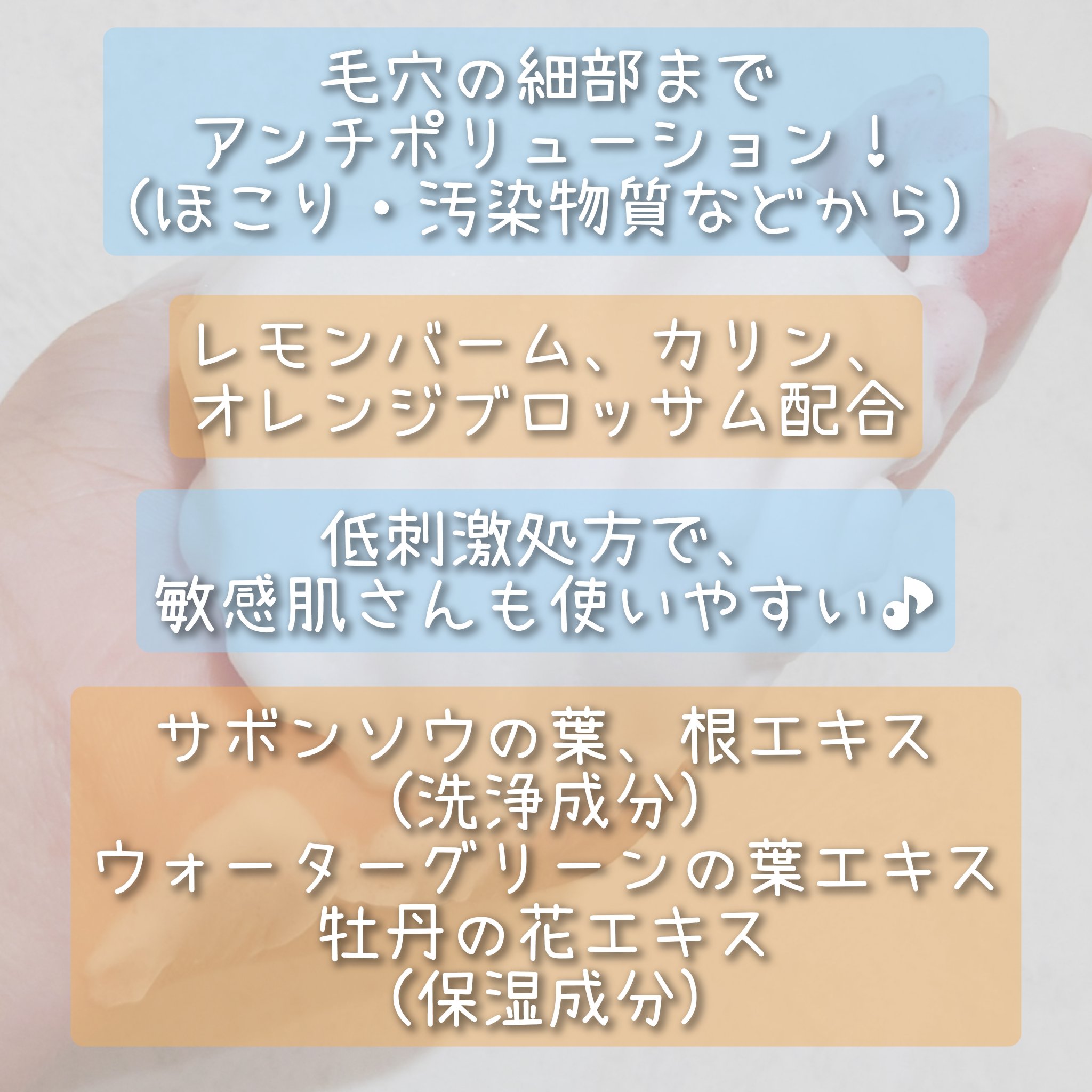 - 水、グリセリン、ミリスチン酸、ソルビトール、パルミチン酸、水酸化カリウム、ステアリン酸、ラウリン酸、オリーブ油脂肪酸セテアリル、ココイルグリシンK、1,3-ブタンジオール、ココイルイセチオン酸Na、オリーブ油脂肪酸ソルビタン、ヤシシボウサンK、ツバキ花エキスBG、ココナツヤシ脂肪酸、ココイルイセチオン酸Na、ポリアクリル酸ナトリウム、スベリヒユエキス、リン酸水素二ナトリウムEDTA、ヒメコウジ葉エキス、1,3-プロパンジオール、アジピン酸ジイソプロピル、レシチン、サボンソウ葉エキス、1,2-ヘキサンジオール、アクリル酸/アクリルアミドメチルプロパンスルホン酸共重合、ジメチルメトキシクロマノール、カプリル酸グリセリル、クエン酸、安息香酸ナトリウム、ソルビン酸カリウム、キサンタンガム、かりんエキス、レモンバームエキス、オレンジ花エキス、香料、リモネン、ヒドロキシシトロネラール