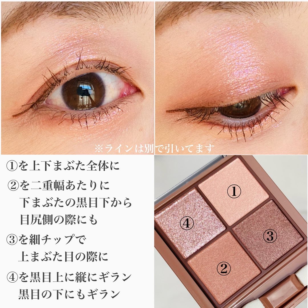 - 透け感マット×濃厚ブラウンの4色アイシャドウ。 しっかり目元を引き締めるビターなブラウンカラー。 透け感のあるブラウンを重ねて、自然な陰影のある目元へ。 ふんわり柔らかなパウダーなので、スルスル伸びてまぶたにピタッと密着。 保湿成分(スクワラン、ホホバ種子油)配合。