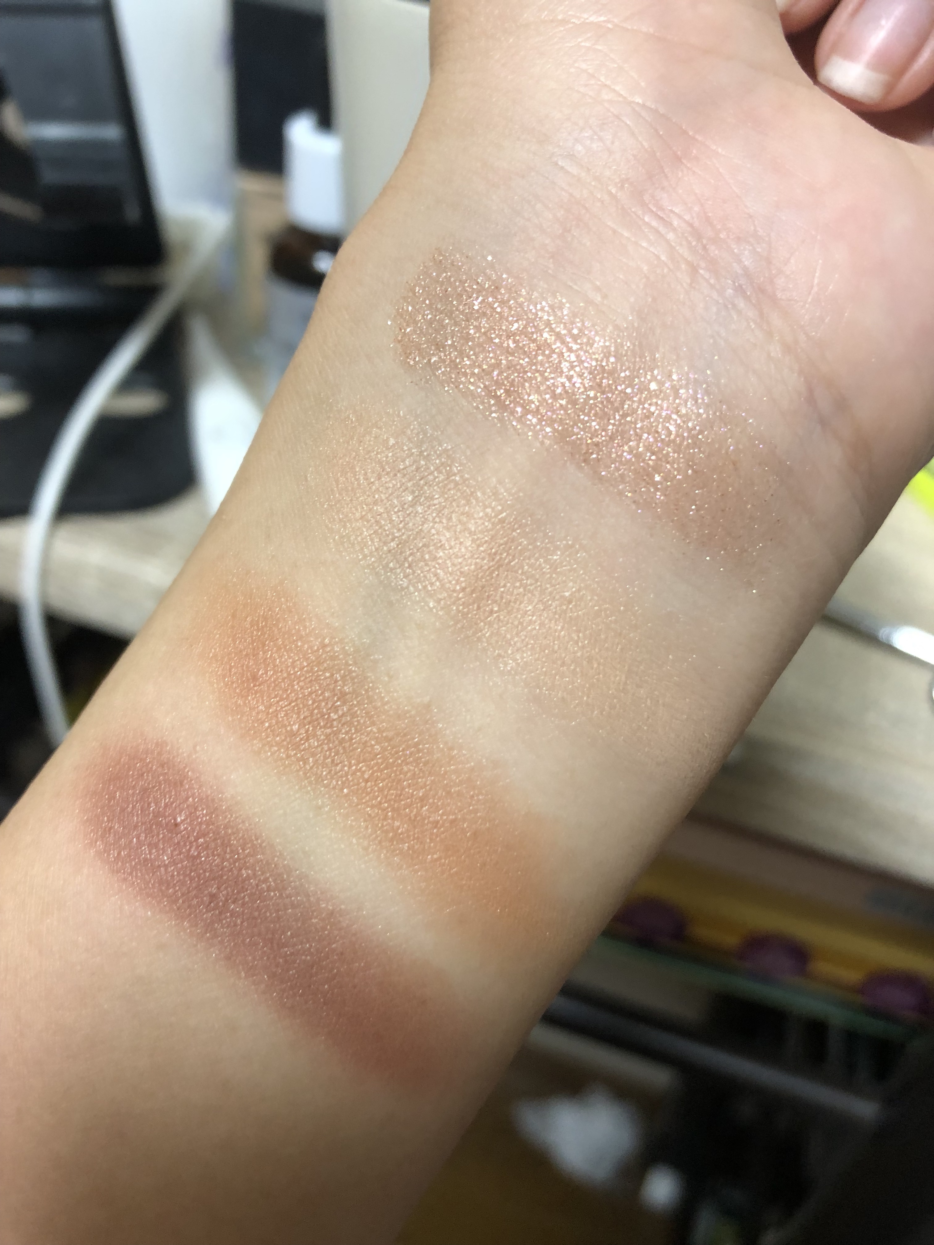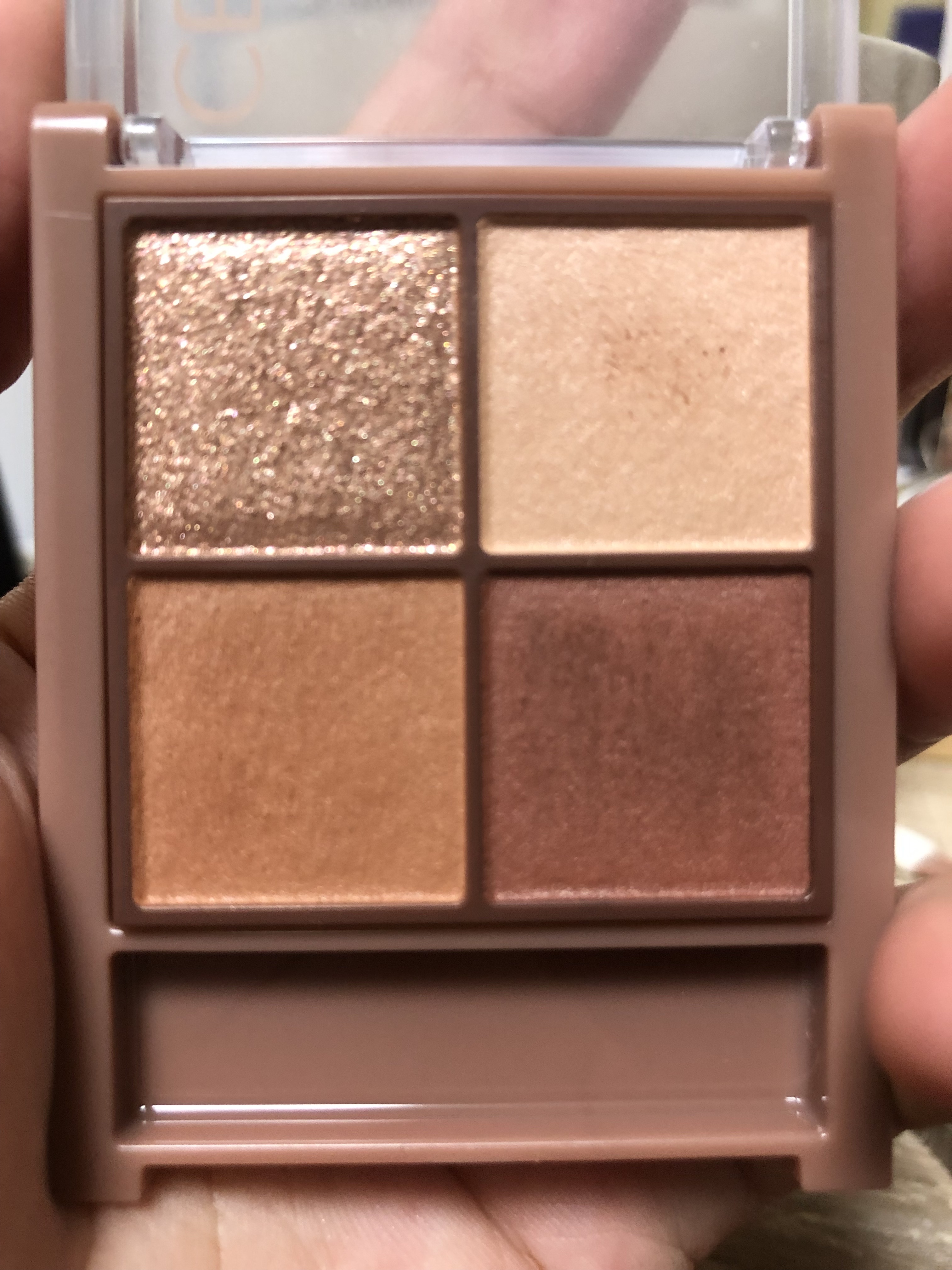 まず発色薄いです笑 ナチュラルメイクですかな。 あと、公式の画像とか見たかんじでは黄み寄りなのかなぁと思っていたんですけど、ほんのりピンク寄りな気がします。 左上のカラーがピンクすぎるのかなぁ🤔 右下も赤みのあるブラウン、ココアブラウン?みたいな。 左上使わないで他の3色でメイクすると公式画像のイメージっぽくなるのに左上使っちゃうと微妙になる。 粉質の良さとラメの可愛さはしっかりです。 でもべターザンアイズのシリーズ好きですよ。 マット3色(ベース・メイン・締め色)にラメ1色の構成って最高じゃね?って。塗るとき迷わないですし。 また新作に期待したいと思います。