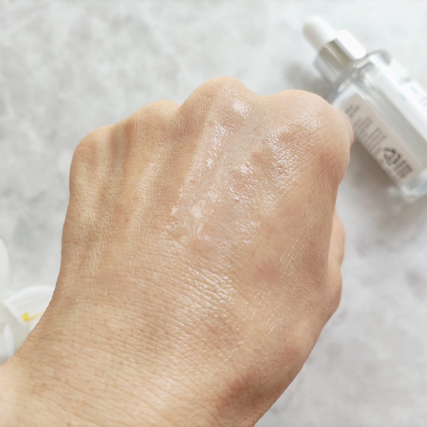 しっとりな使い心地がうれしい💛 高級感のあるガラスボトルがとっても素敵です! オイル層とローション層に分かれてるのでまずはよ~く振ってから使ってね。 オイルが入っているとは思えないようなサラッとしたテクスチャー✨ なじませると、みずみずしく しっとりとした使い心地です🤍 肌にほどよいツヤ感が出るので、ツヤ肌メイク好きの方にも向いている思う! 9つのフリー処方なのも、ゆらぎ肌にはうれしい処方だよね。