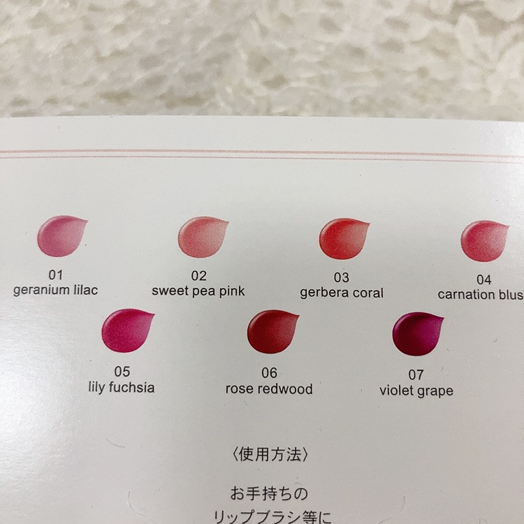 - <01 geranium lilac> ラウロイルグルタミン酸ジ(フィトステリル/オクチルドデシル)、ダイマージリノール酸(フィトステリル/イソステアリル/セチル/ステアリル/ベヘニル)、トリイソステアリン酸ポリグリセリル-2、イソステアリン酸デキストリン、パルミチン酸デキストリン、ポリブテン、(カプリル/カプリン/ミリスチン/ステアリン酸)トリグリセリル、(パルミチン酸/エチルヘキサン酸)デキストリン、テトライソステアリン酸ペンタエリスリチル、スクワラン、エーデルワイス花/葉エキス、オレンジ果汁、クチナシエキス、ダマスクバラ花エキス、トコフェロール、BG、BHT、DPG、(エチレン/プロピレン)コポリマー、クエン酸、グリセリン、シリカ、ジメチコン、トリイソステアリン酸イソプロピルチタン、ハイドロゲンジメチコン、バニリルブチル、メチコン、メントキシプロパンジオール、水、水酸化Al、炭酸Ca、サリチル酸、香料、マイカ、酸化チタン、酸化鉄、黄4、赤202 <02 sweet pea pink> ラウロイルグルタミン酸ジ(フィトステリル/オクチルドデシル)、ダイマージリノール酸(フィトステリル/イソステアリル/セチル/ステアリル/ベヘニル)、トリイソステアリン酸ポリグリセリル-2、イソステアリン酸デキストリン、パルミチン酸デキストリン、ポリブテン、(カプリル/カプリン/ミリスチン/ステアリン酸)トリグリセリル、(パルミチン酸/エチルヘキサン酸)デキストリン、テトライソステアリン酸ペンタエリスリチル、スクワラン、エーデルワイス花/葉エキス、オレンジ果汁、クチナシエキス、ダマスクバラ花エキス、トコフェロール、BG、BHT、DPG、(エチレン/プロピレン)コポリマー、クエン酸、グリセリン、シリカ、ジメチコン、トリイソステアリン酸イソプロピルチタン、ハイドロゲンジメチコン、バニリルブチル、メチコン、メントキシプロパンジオール、水、水酸化Al、炭酸Ca、サリチル酸、香料、マイカ、酸化チタン、酸化鉄、黄4、赤202 <03 gerbera coral> ラウロイルグルタミン酸ジ(フィトステリル/オクチルドデシル)、ダイマージリノール酸(フィトステリル/イソステアリル/セチル/ステアリル/ベヘニル)、トリイソステアリン酸ポリグリセリル-2、イソステアリン酸デキストリン、パルミチン酸デキストリン、ポリブテン、(カプリル/カプリン/ミリスチン/ステアリン酸)トリグリセリル、(パルミチン酸/エチルヘキサン酸)デキストリン、テトライソステアリン酸ペンタエリスリチル、スクワラン、エーデルワイス花/葉エキス、オレンジ果汁、クチナシエキス、ダマスクバラ花エキス、トコフェロール、BG、BHT、DPG、(エチレン/プロピレン)コポリマー、クエン酸、グリセリン、シリカ、ジメチコン、トリイソステアリン酸イソプロピルチタン、ハイドロゲンジメチコン、バニリルブチル、ホウケイ酸(Ca/Na)、メチコン、メントキシプロパンジオール、酸化スズ、水、水酸化Al、炭酸Ca、サリチル酸、香料、酸化チタン、酸化鉄、黄4、赤202 <04 carnation blush> ラウロイルグルタミン酸ジ(フィトステリル/オクチルドデシル)、ダイマージリノール酸(フィトステリル/イソステアリル/セチル/ステアリル/ベヘニル)、トリイソステアリン酸ポリグリセリル-2、イソステアリン酸デキストリン、パルミチン酸デキストリン、ポリブテン、(カプリル/カプリン/ミリスチン/ステアリン酸)トリグリセリル、(パルミチン酸/エチルヘキサン酸)デキストリン、テトライソステアリン酸ペンタエリスリチル、スクワラン、エーデルワイス花/葉エキス、オレンジ果汁、クチナシエキス、ダマスクバラ花エキス、トコフェロール、BG、BHT、DPG、(エチレン/プロピレン)コポリマー、クエン酸、グリセリン、シリカ、ジメチコン、トリイソステアリン酸イソプロピルチタン、ハイドロゲンジメチコン、バニリルブチル、メチコン、メントキシプロパンジオール、水、水酸化Al、炭酸Ca、サリチル酸、香料、マイカ、酸化チタン、酸化鉄、黄4、赤202 <05 lily fuchsia> ラウロイルグルタミン酸ジ(フィトステリル/オクチルドデシル)、ダイマージリノール酸(フィトステリル/イソステアリル/セチル/ステアリル/ベヘニル)、トリイソステアリン酸ポリグリセリル-2、イソステアリン酸デキストリン、パルミチン酸デキストリン、ポリブテン、(カプリル/カプリン/ミリスチン/ステアリン酸)トリグリセリル、(パルミチン酸/エチルヘキサン酸)デキストリン、テトライソステアリン酸ペンタエリスリチル、スクワラン、エーデルワイス花/葉エキス、オレンジ果汁、クチナシエキス、ダマスクバラ花エキス、トコフェロール、BG、BHT、DPG、(エチレン/プロピレン)コポリマー、クエン酸、グリセリン、シリカ、ジメチコン、トリイソステアリン酸イソプロピルチタン、ハイドロゲンジメチコン、バニリルブチル、メチコン、メントキシプロパンジオール、水、水酸化Al、炭酸Ca、サリチル酸、香料、マイカ、酸化チタン、酸化鉄、黄4、赤202 <06 rose redwood> ラウロイルグルタミン酸ジ(フィトステリル/オクチルド