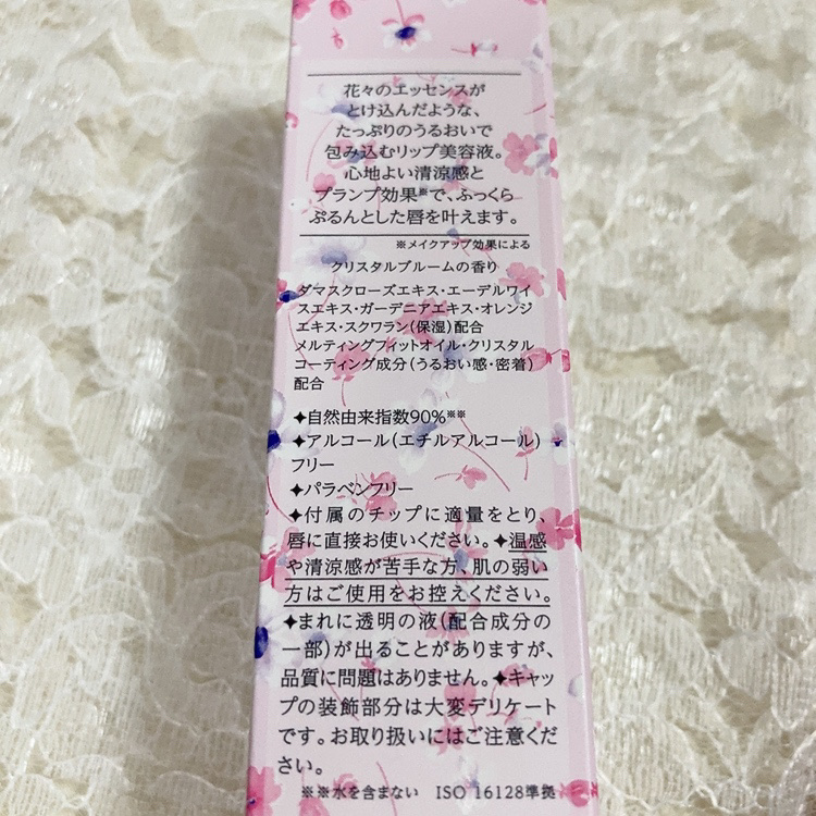 - ふっくらハリのある仕上がりで花束のように華やぐ。 自然由来指数90%※1で唇を優しく包む花蜜リッププランパー※2 ・心地よい清涼感とプランプ効果※3でふっくらハリのある唇に仕上がります。唇が温かさを感じる成分と、冷たさを感じるメントール誘導体を配合しました。高い保湿効果でたっぷりのうるおいをあたえるメルティングフィットオイル、唇を厚い膜で包み、ツヤをあたえて保護するクリスタルコーティング成分、さらに5種類の植物由来の保湿成分を配合。ふっくらぷるんと、ツヤの高い唇を演出します。 ・クリスタルブルームの香り ※1 自然由来指数90%(水を含まない)ISO 16128 準拠。 ※2花蜜のような使用感。プランプはメイクアップ効果による。※3 メイクアップ効果による。