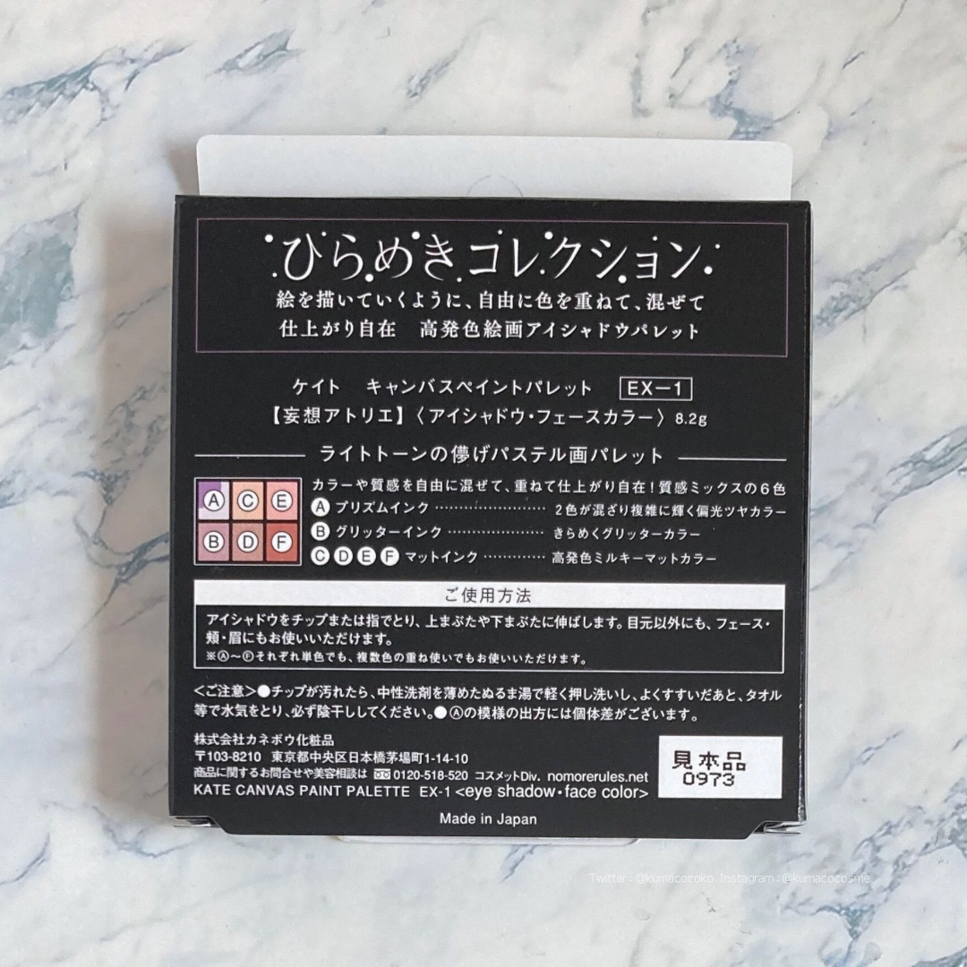 - <EX-1 妄想アトリエ> タルク、ジメチコン、リンゴ酸ジイソステアリル、ジエチルヘキサン酸ネオペンチルグリコール、シリカ、ダイマージリノール酸(フィトステリル/イソステアリル/セチル/ステアリル/ベヘニル)、(ジメチコン/ビニルジメチコン)クロスポリマー、カルナウバロウ、ジステアリン酸Al、セスキイソステアリン酸ソルビタン、ミリスチン酸亜鉛、トコフェロール、ラウロイルリシン、クロルフェネシン、デヒドロ酢酸Na、(+/-)グンジョウ、マイカ、酸化チタン、酸化鉄、水酸化Al、硫酸Ba、酸化スズ、ホウケイ酸(Ca/Al)、黄4、赤202、赤226 <EX-2 夢幻ミュージアム> タルク、ジメチコン、リンゴ酸ジイソステアリル、ジエチルヘキサン酸ネオペンチルグリコール、シリカ、ダイマージリノール酸(フィトステリル/イソステアリル/セチル/ステアリル/ベヘニル)、(ジメチコン/ビニルジメチコン)クロスポリマー、カルナウバロウ、ジステアリン酸Al、セスキイソステアリン酸ソルビタン、ミリスチン酸亜鉛、トコフェロール、ラウロイルリシン、クロルフェネシン、デヒドロ酢酸Na、(+/-)グンジョウ、マイカ、酸化チタン、酸化鉄、水酸化Al、硫酸Ba、酸化スズ、ホウケイ酸(Ca/Al)、黄4、赤202、赤226