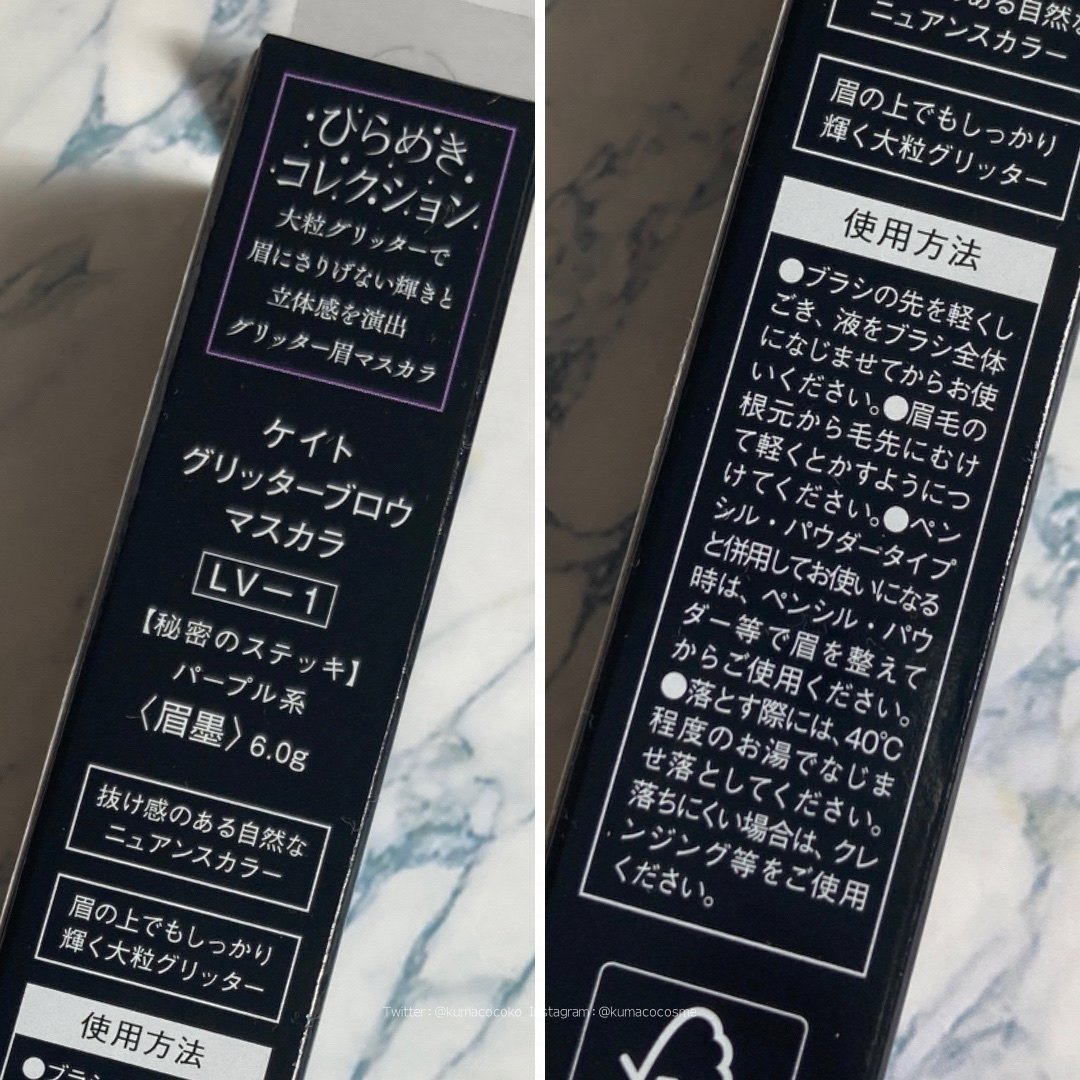 ケイトさんより2023年9月23日(土)〜 数量限定で発売されます ひらめきコレクションから こちらの💁♀️眉墨のご紹介です🤗✨ ビジュアルアーティストの Takako Noelさんとケイトさんの コラボレーション商品で 色彩豊かで個性あふれる限定デザイン グリッターブロウマスカラ 🪄 LV-1 秘密のステッキ 🪄 様々なカラーに煌めく グリッターの発色を邪魔しない ニュアンスラベンダー🪻カラーの アイブロウマスカラ(眉墨) グリッターブロウマスカラ 🪄 LV-1 秘密のステッキは 単品使いでも いつものアイブロウメイクに +して使用しても 1塗りで透明感のある 華やかな印象の眉に魅せる事ができて🙆♀️💖✨ マスカラに+して使用しても可愛かったです🥰 ケイトさんのひらめきコレクションを チェックしてみてにゃっ😸♪