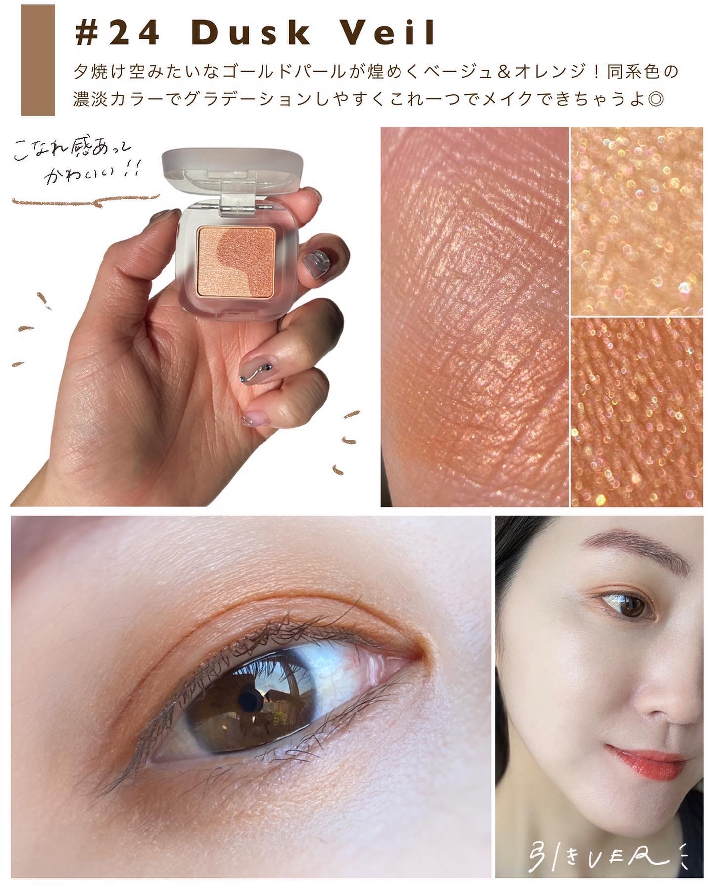 2023年にどどんとリニューアル!全30色展開で新たに発売をスタートしました。 多色パールがこれでもか!ってくらいたっぷり煌めくピンクベージュはほんの少しオレンジのニュアンスも感じられるヘルシーなカラー。 こういうピンクベージュ系の単色シャドウって、ほんとにメイクのベース的に使いやすくて重宝するのよね😚